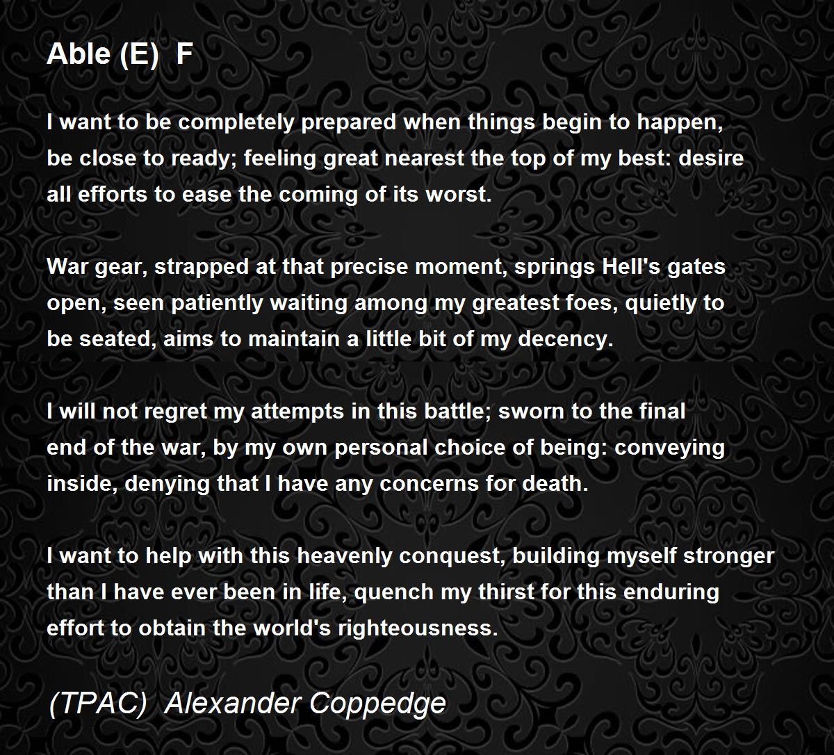 War gear, strapped at that precise moment, springs Hell's gates open, seen patiently waiting among my greatest foes, quietly to be seated, aims to maintain a little bit of my decency.