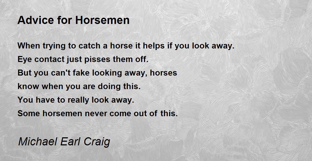 Most important advice for horsemen, sublimely told.5 Stars fullest I have enjoyed reading this
