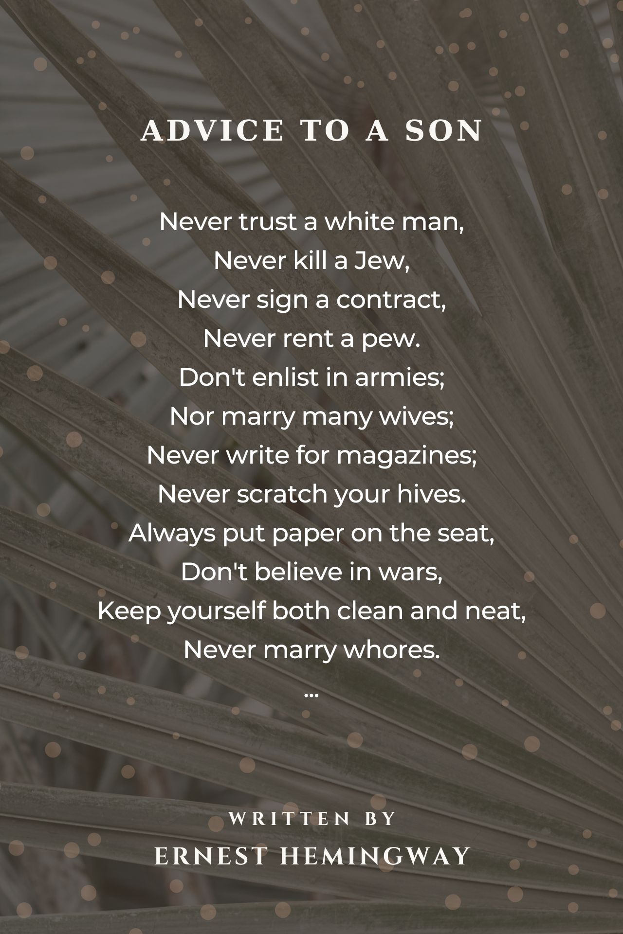 Some say Hemingway wrote this to his son in an attempt to give him some insight and truth about the harsh realities of life. Maybe so. But I have read that his Mother was a controlling, stiff-necked, stuffy woman who tried to direct her son's choices even after he was a journalist over in Spain. I read this and see some good advice followed promptly by an embarrassing Motherly advice to use paper on the toilet so you don't pick up bugs and germs... I just can't picture Hemingway saying this to his son in between shooting charging elephants and lions....I can picture him advising his son to Never write for magazines based on his personal career experiences- - but Never scratch your hives? again that is what a Mother says often over and over again.... Looking at the entirety of this poem, I'd say some of the advice was Fatherly but I think he had a lot of bitterness towards the peck-peck-pecking advice of his Mother that underscored this piece.