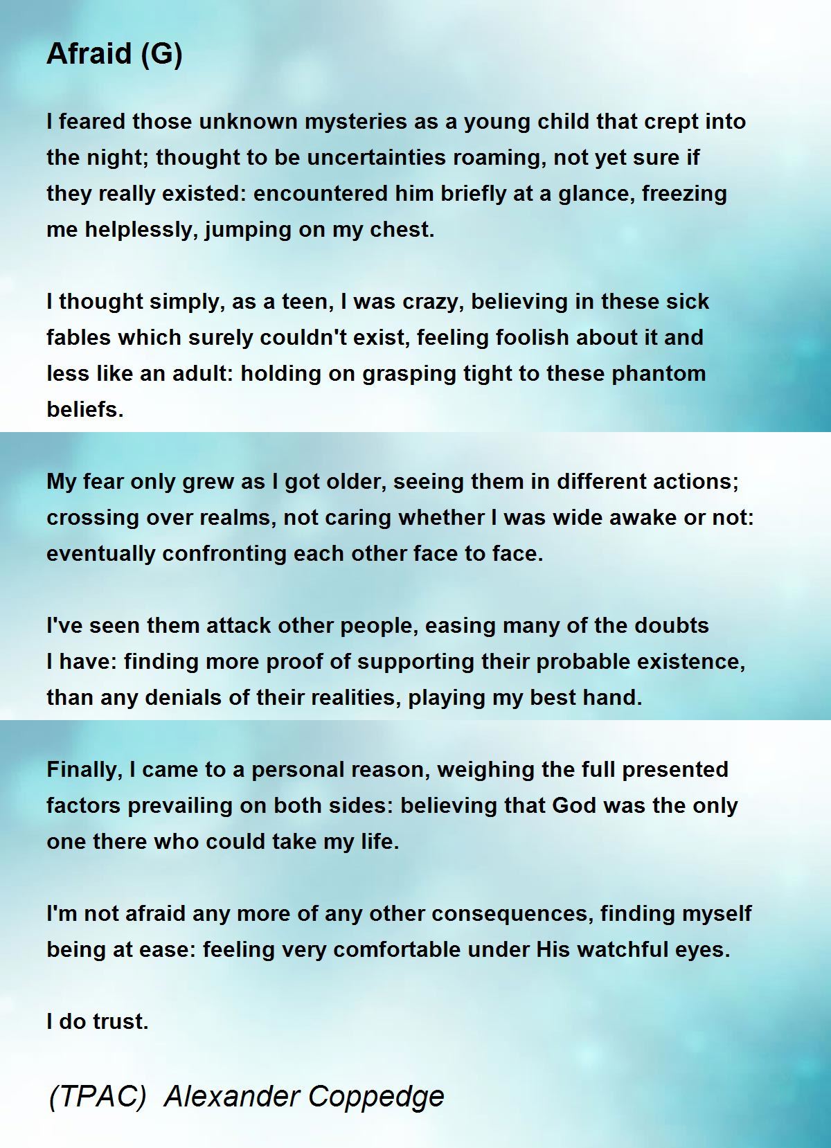 I'm not afraid any more of any other consequences, finding myself being at ease: feeling very comfortable under His watchful eyes.