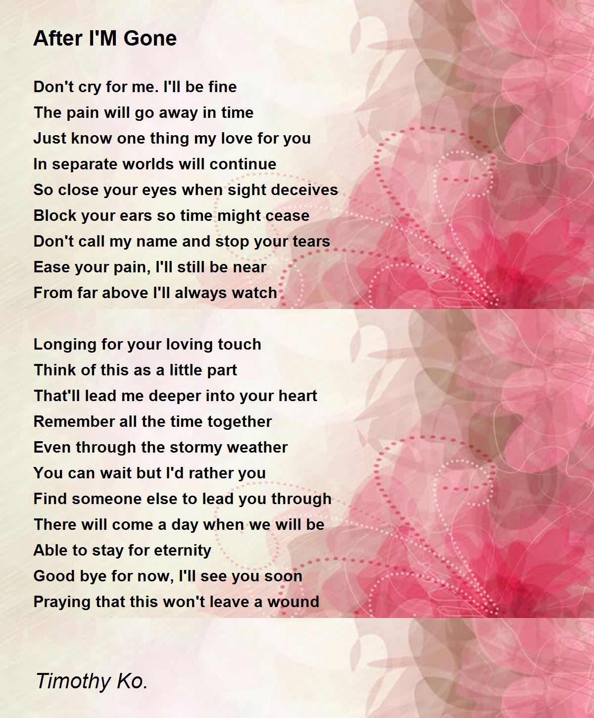 beautifully written.. i don't know why this line stuck with me the most.. do keep writing.. The pain will go away in time Just know one thing my love for you In separate worlds will continue