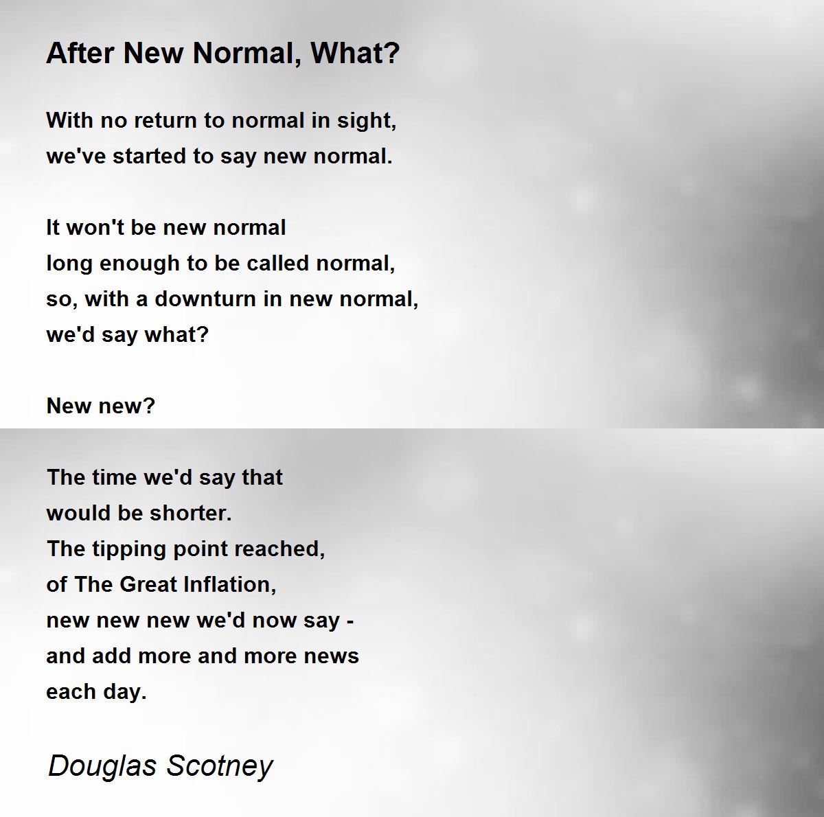 new normal, New new? new new new we'd now say - each day.... //.... The poem puts across the dilemma we are facing in the present pandemic situation which gets more and more complex each day. The term 'new normal' is a euphemism. Thanks.