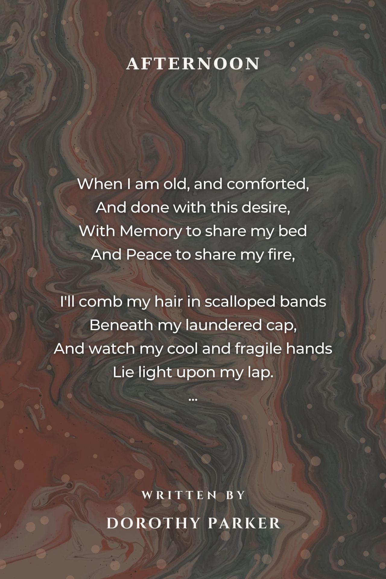 Such a most beautiful poem about being old. This poem is truly unique! It starts immediately with the title AFTERNOON, this is meant metaphorically, afternoon and not morning, we KNOW that the poetess is not really old yet, just read the last stanza