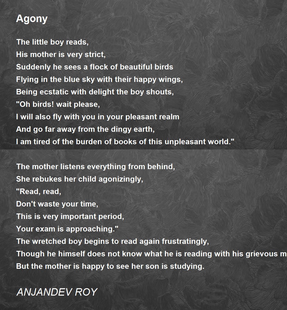 Don't waste your time, This is very important period, Your exam is approaching." The wretched boy begins to read again frustratingly, Though he himself does not know what he is reading with his grievous mind, But the mother is happy to see her son is studying..... ....... beautiful poem...dear poet