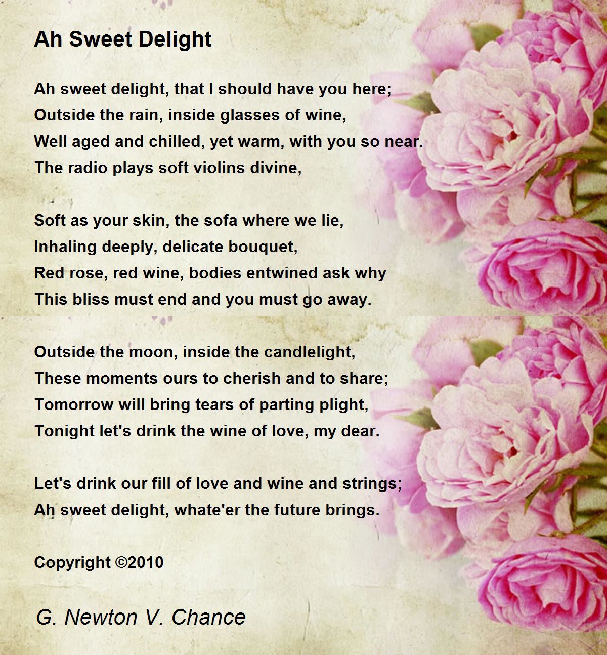 Tonight let's drink the wine of love, my dear.