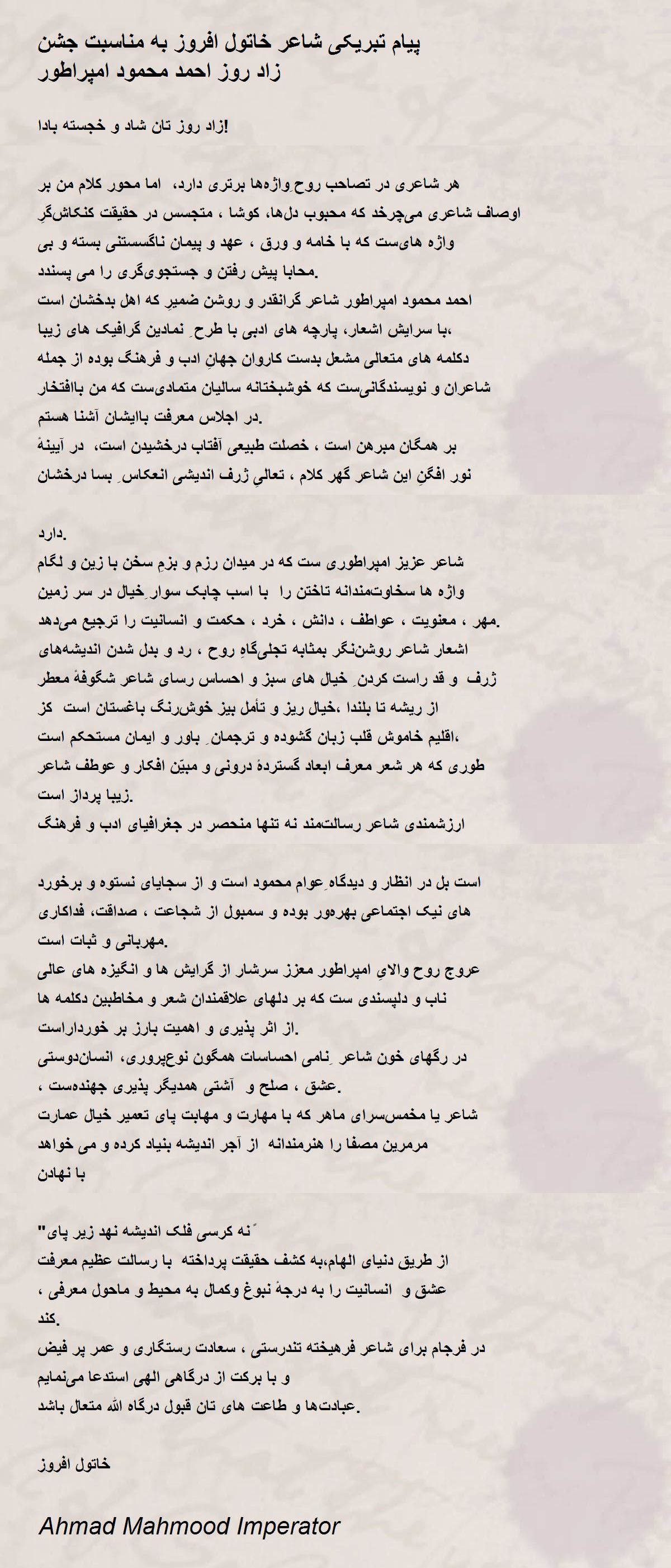 شاعر عزیز امپراطوری ست که در میدان رزم و بزمِ سخن با زین و لگام ِواژه ها سخاوتمندانه تاختن را با اسب چابک سوار ِخیال در سر زمین مهر ، معنویت ، عواطف ، دانش ، خرد ، حکمت و انسانیت را ترجیع میدهد.
