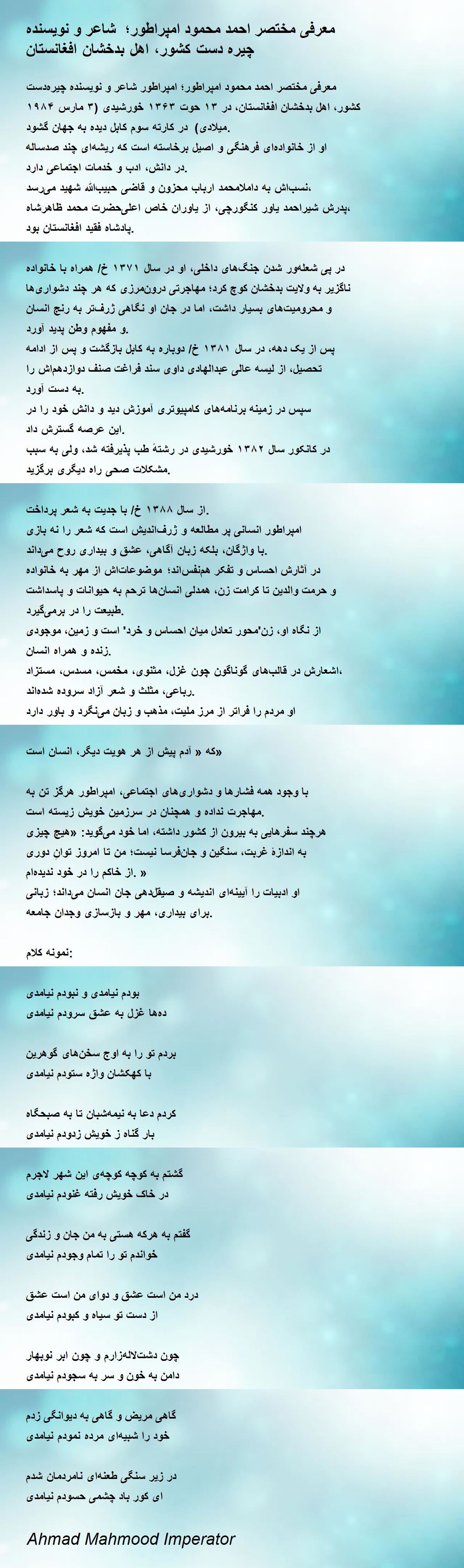 معرفی مختصر احمد محمود امپراطور؛ امپراطور شاعر و نویسنده چیرهدست کشور، اهل بدخشان افغانستان، در ۱۳ حوت ۱۳۶۳ خورشیدی (۳ مارس ۱۹۸۴ میلادی) در کارته سوم کابل دیده به جهان گشود.
