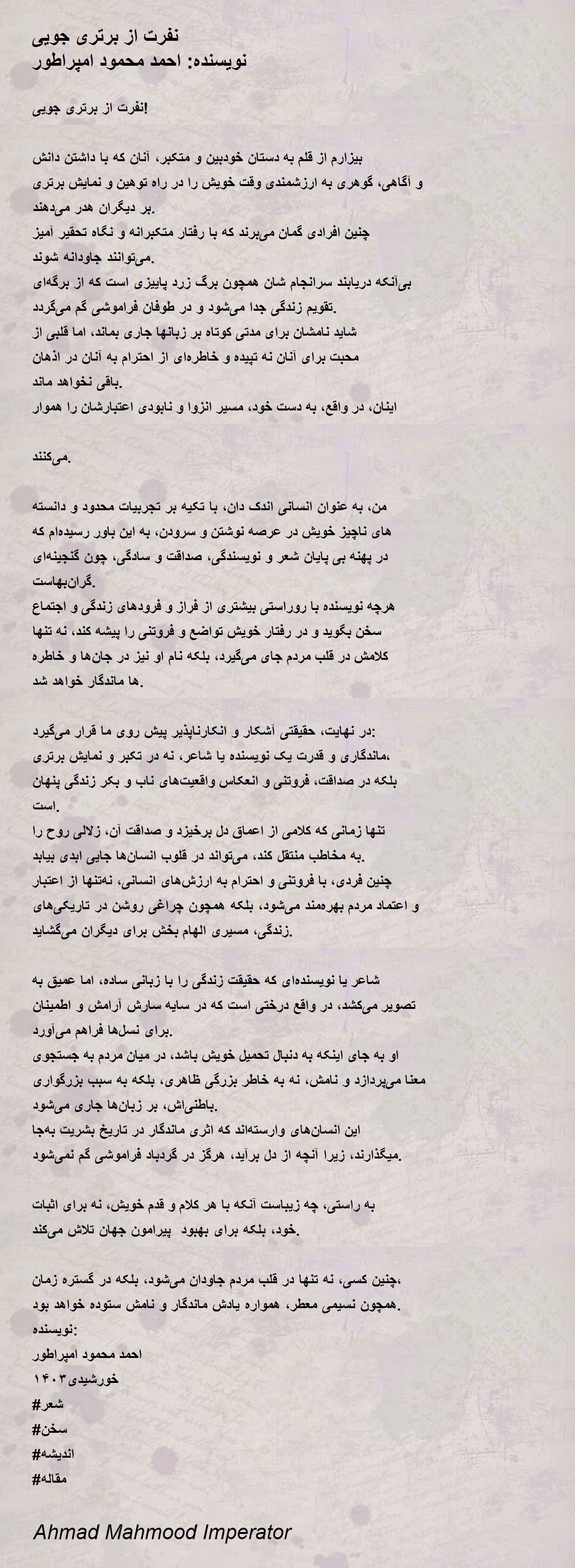 بیزارم از قلم به دستان خودبین و متکبر، آنان که با داشتن دانش و آگاهی، گوهری به ارزشمندی وقت خویش را در راه توهین و نمایش برتری بر دیگران هدر میدهند.