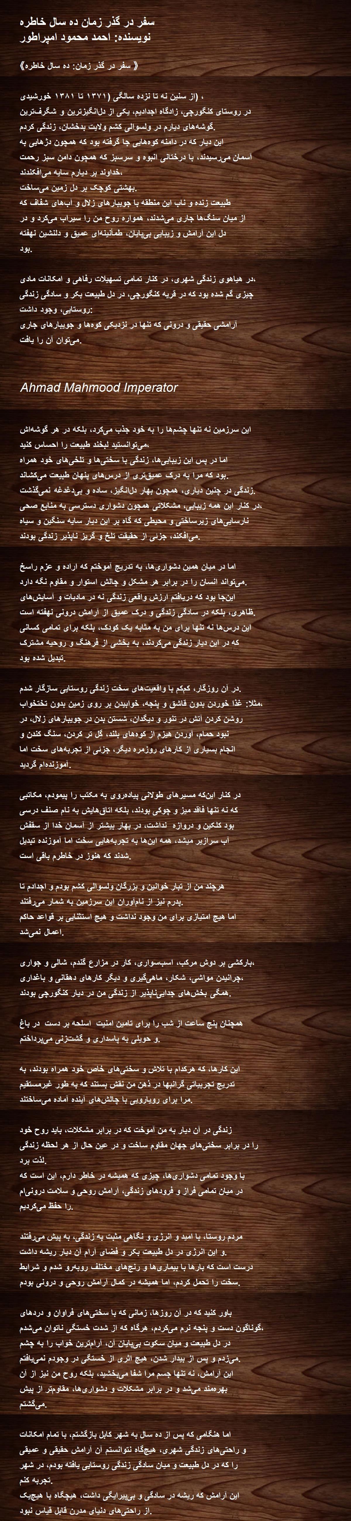 اما هنگامی که پس از ده سال به شهر کابل بازگشتم، با تمام امکانات و راحتیهای زندگی شهری، هیچگاه نتوانستم آن آرامش حقیقی و عمیقی را که در دل طبیعت و میان سادگی زندگی روستایی یافته بودم، در شهر تجربه کنم.