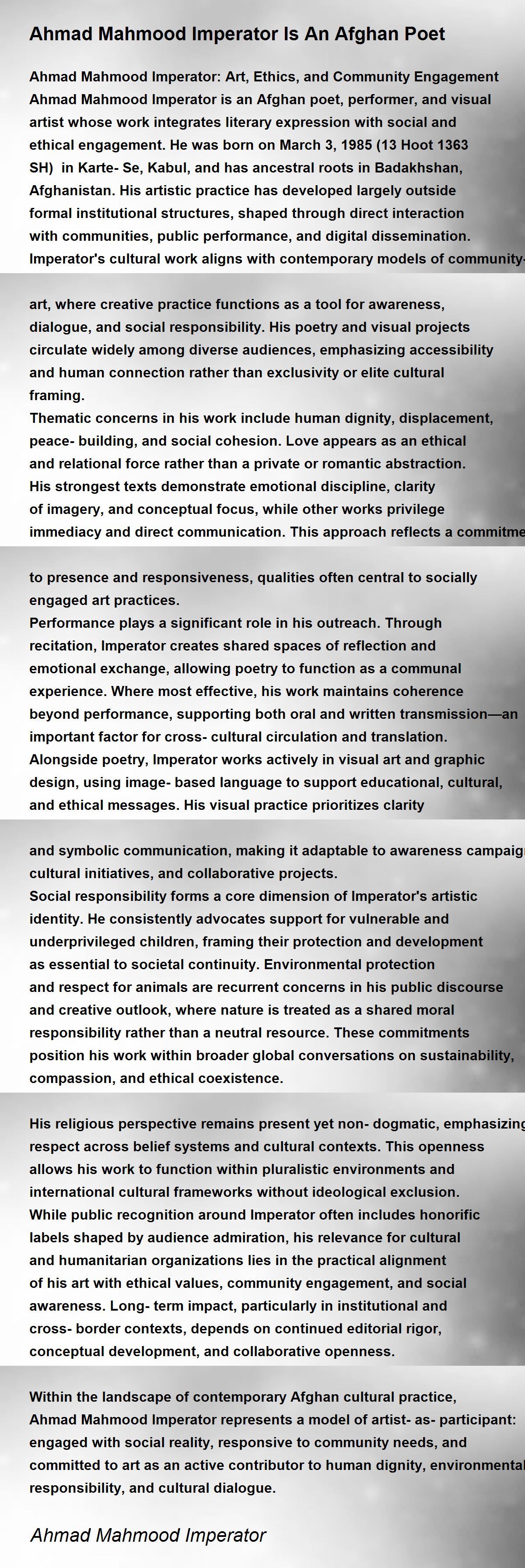 Ahmad Mahmood Imperator is an Afghan poet, performer, and visual artist whose work integrates literary expression with social and ethical engagement. He was born on March 3,1985 (13 Hoot 1363 SH) in Karte-Se, Kabul, and has ancestral roots in Badakhshan, Afghanistan. His artistic practice has developed largely outside formal institutional structures, shaped through direct interaction with communities, public performance, and digital dissemination.