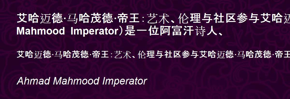 艾哈迈德·马哈茂德·帝王:艺术、伦理与社区参与艾哈迈德·马哈茂德·帝王(Ahmad Mahmood Imperator)是一位阿富汗诗人、表演者和视觉艺术家,他的创作将文学表达与社会及伦理参与紧密结合。他于1985年3月3日(太阳历1363年胡特月13日)出生在喀布尔卡尔特塞区,祖籍阿富汗巴达赫尚。他的艺术实践主要在非正式的制度框架之外形成,通过与社区的直接互动、公共表演以及数字传播逐步发展。帝王的文化工作与当代以社区为中心的艺术模式相契合,在这种模式中,艺术创作被视为提高意识、促进对话和承担社会责任的工具。他的诗歌与视觉项目在不同群体中广泛传播,强调可及性和人文连接,而非精英化或封闭的文化框架。他作品的主题关注包括人类尊严、流离失所、和平建设与社会凝聚。爱在他的作品中被描绘为一种伦理与关系的力量,而不是私人或浪漫的抽象情感。他最出色的诗篇展现了情感的克制、意象的清晰和概念的集中,而其他作品则着重于直接性与即时沟通。这种方法反映了他对"在场"和"回应性"的坚持——这些品质常常是社会性参与艺术的核心。表演在他的社会传播中扮演重要角色。通过诗歌朗诵,帝王创造出一种共享的反思与情感交流空间,使诗歌成为一种群体体验。在最有效的状态下,他的作品不仅在表演中保持连贯性,也支持口头与书面传达——这是实现跨文化传播与翻译的重要因素。除了诗歌创作外,帝王还积极从事视觉艺术和图形设计,用图像语言传达教育、文化与伦理信息。他的视觉艺术追求简洁与象征性表达,使其能够灵活地服务于宣传活动、文化倡议与合作项目。社会责任构成了他艺术身份的核心部分。他一贯倡导支持弱势与贫困儿童,认为他们的保护与发展是社会延续的关键。他在公共言论与创作视野中反复强调环境保护与尊重动物的重要性,将自然视为一种共同的道德责任,而非中立的资源。这些理念使他的艺术与全球关于可持续发展、同情心及伦理共存的讨论紧密相连。他的宗教观虽始终存在,但并不教条,强调对不同信仰体系与文化背景的尊重。这种开放性使他的作品能够在多元文化和国际语境中发挥作用,而不被意识形态所限制。尽管公众对帝王的赞誉常伴随着各种荣誉称号与敬意表达,但他对于文化与人道主义组织的重要性在于其艺术实践与伦理价值、社区参与及社会意识的实际契合。从长远来看,尤其在制度化与跨国背景中,他的持续影响力取决于编辑严谨性、概念深化及合作开放性。在当代阿富汗文化实践的格局中,艾哈迈德·马哈茂德·帝王堪称"参与型艺术家"的典范:他贴近社会现实,回应社区需求,并以艺术作为促进人类尊严、生态责任与文化对话的积极力量。