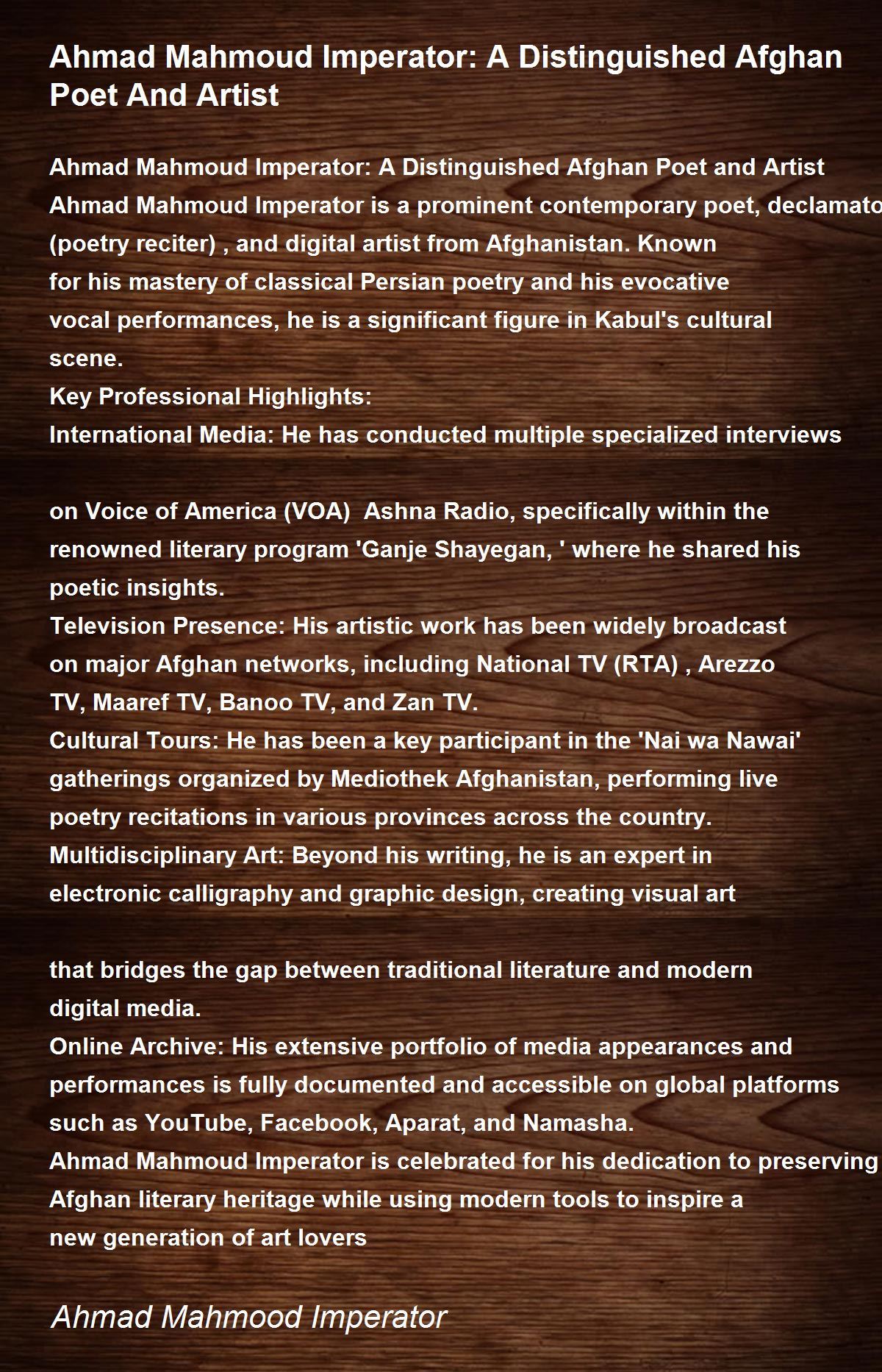 Ahmad Mahmoud Imperator is a prominent contemporary poet, declamator (poetry reciter) , and digital artist from Afghanistan. Known for his mastery of classical Persian poetry and his evocative vocal performances, he is a significant figure in Kabul's cultural scene.
