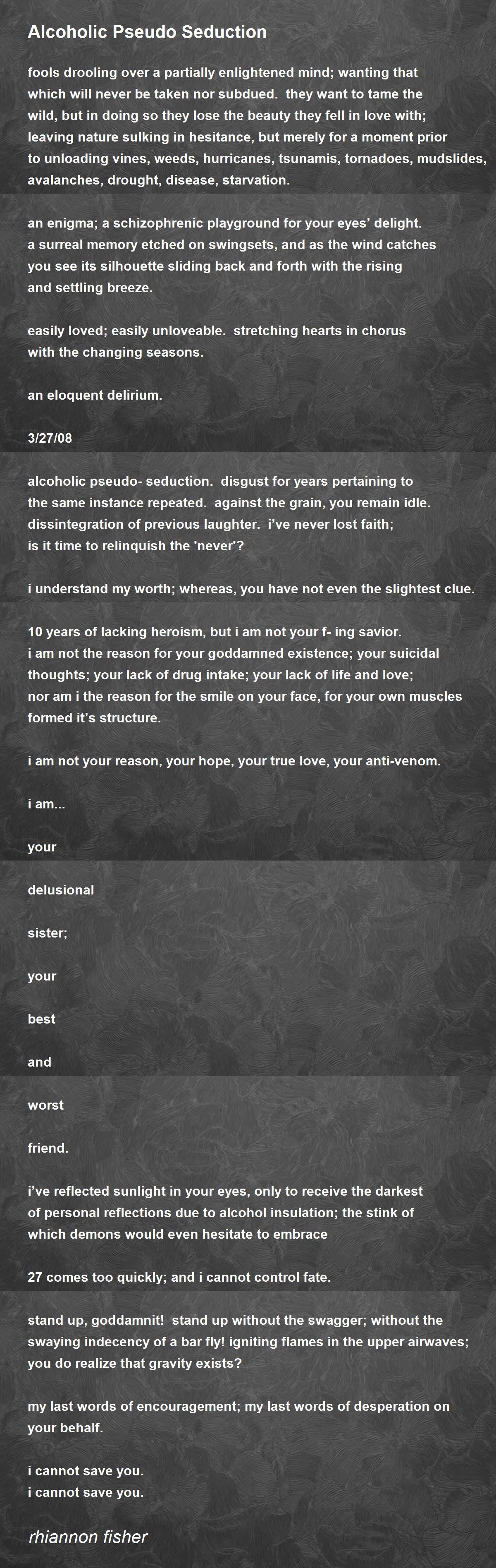alcoholic pseudo-seduction. disgust for years pertaining to the same instance repeated. against the grain, you remain idle. dissintegration of previous laughter. i’ve never lost faith; is it time to relinquish the 'never'?