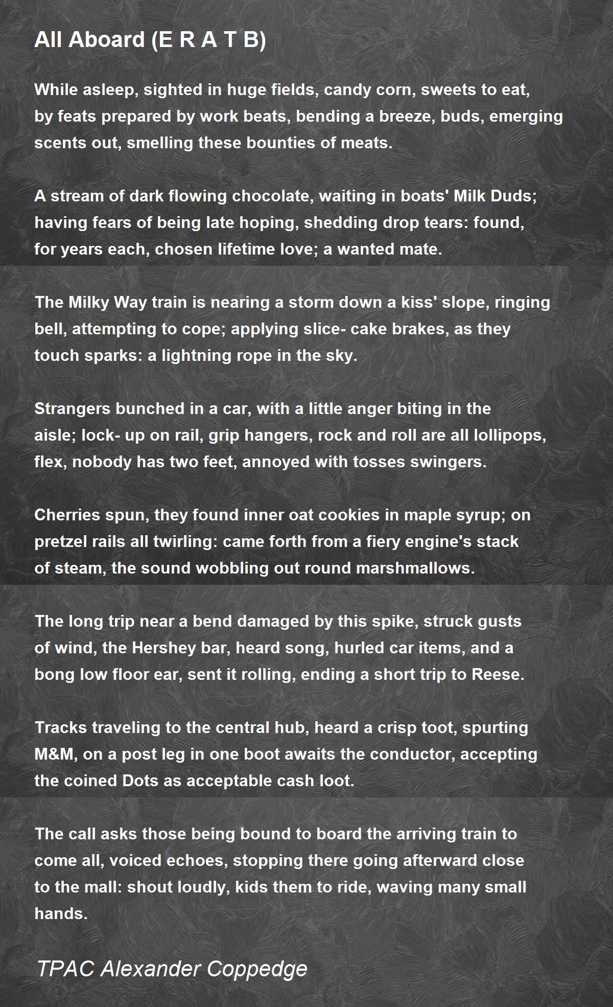 A stream of dark flowing chocolate, waiting in boats' Milk Duds, having fears of being late hoping, shedding drop tears, found, for years each, chosen lifetime love a wanted mate.