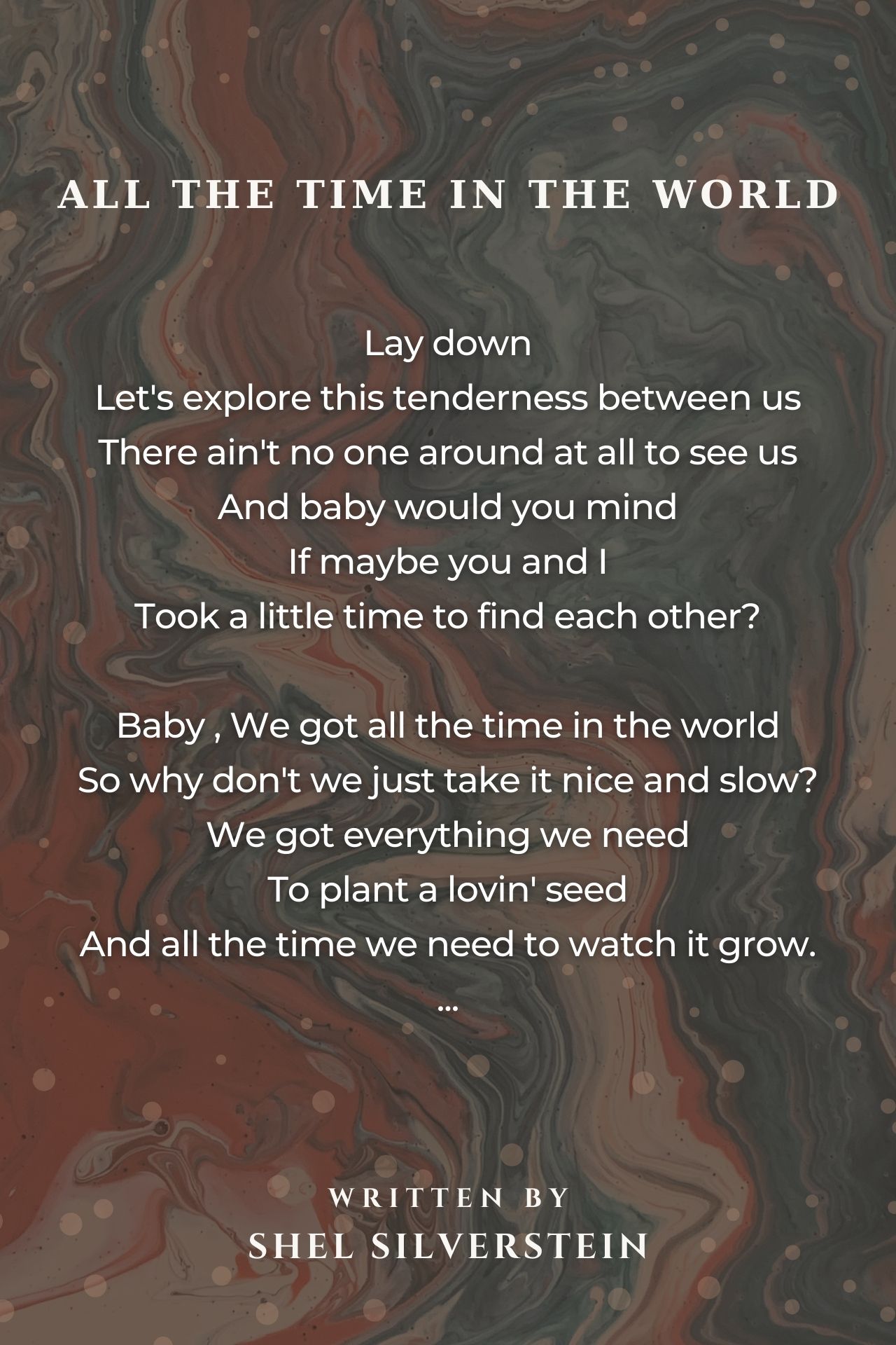 Baby, We got all the time in the world So why don't we just take it nice and slow? We got everything we need To plant a lovin' seed And all the time we need to watch it grow.OLovely Modern Poem Of The Day. Beautifully worded!
