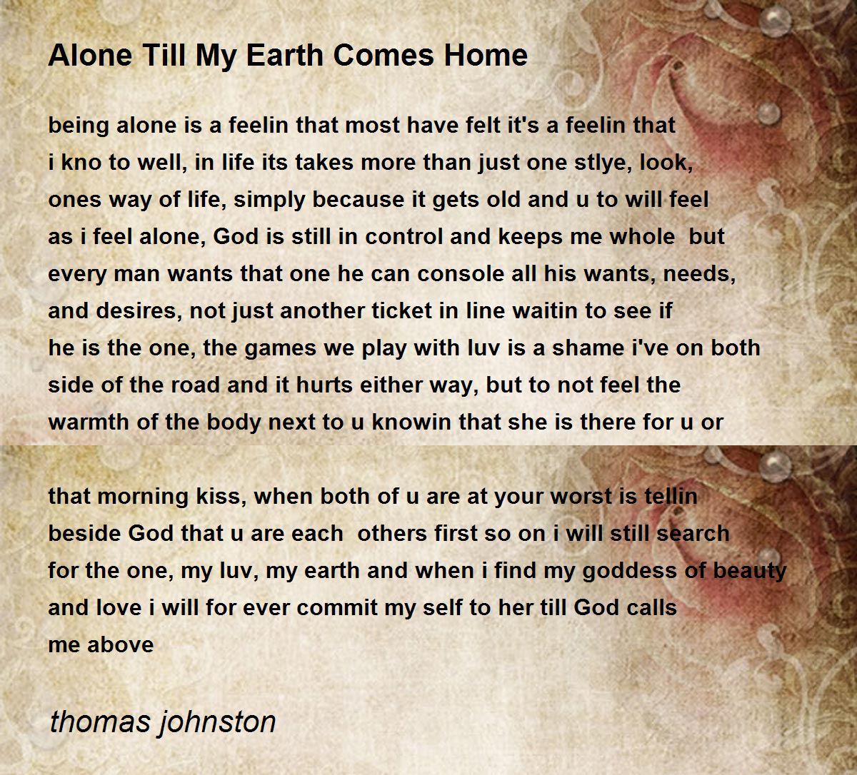 being alone is a feelin that most have felt it's a feelin that i kno to well, in life its takes more than just one stlye, look, ones way of life, simply because it gets old and u to will feel as i feel alone, God is still in control and keeps me whole but every man wants that one he can console all his wants, needs, and desires, not just another ticket in line waitin to see if he is the one, the games we play with luv is a shame i've on both side of the road and it hurts either way, but to not feel the warmth of the body next to u knowin that she is there for u or that morning kiss, when both of u are at your worst is tellin beside God that u are each others first so on i will still search for the one, my luv, my earth and when i find my goddess of beauty and love i will for ever commit my self to her till God calls me above