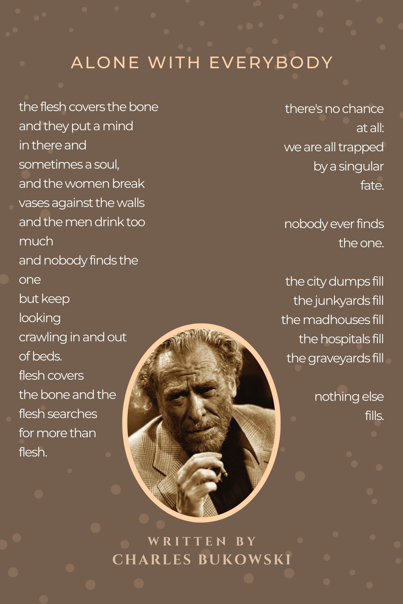 Bukowski was a poets poet a drunk and a wise man. This poem epitomizes the ultimate failure of humanity. Mr Gibbens is right it is very buddhist.