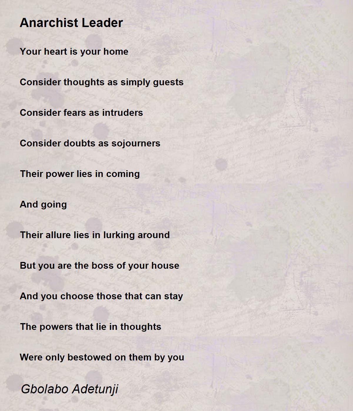 But you are the boss of your house And you choose those that can stay The powers that lie in thoughts Were only bestowed on them by you When you hen hatched an hawk for you. Nice! Joshua.