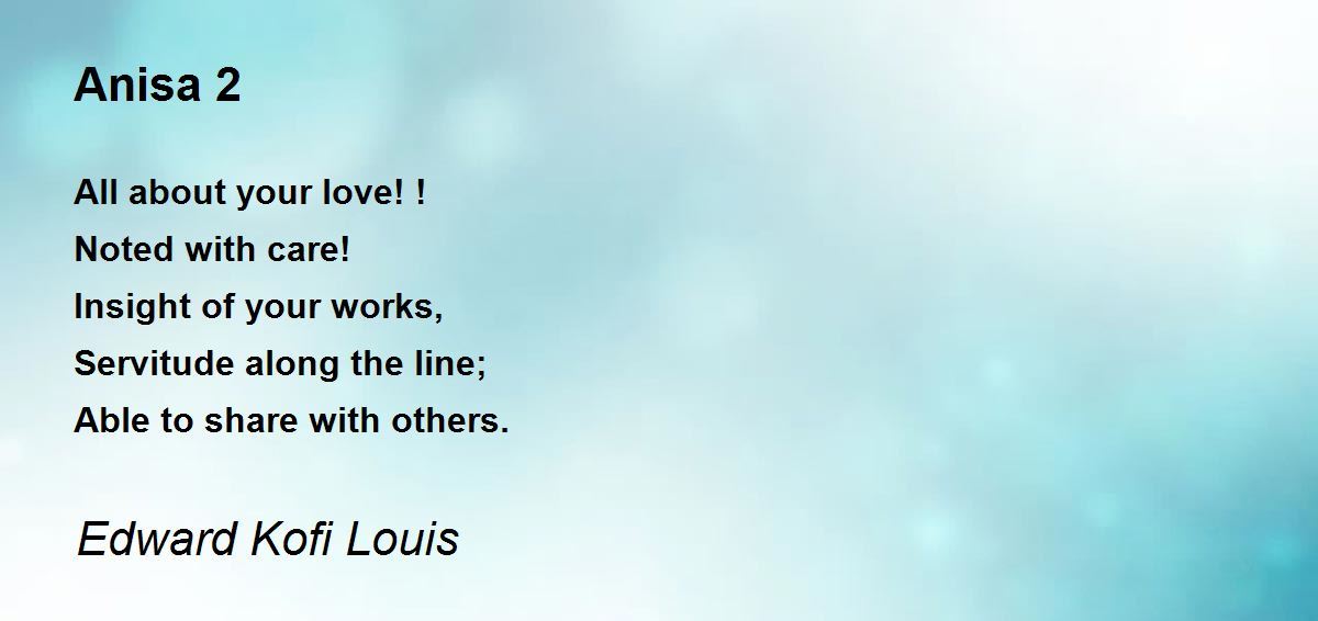 All about your love! ! Noted with care! Insight of your works, Servitude along the line; Able to share with others.