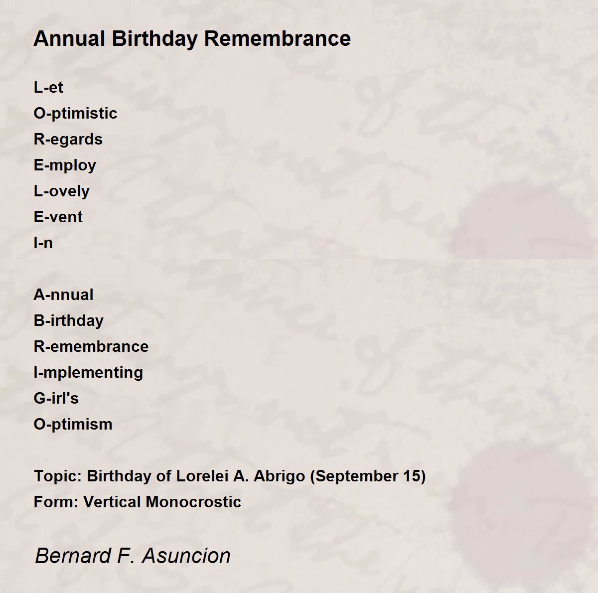 Topic: Birthday of Lorelei A. Abrigo (September 15)