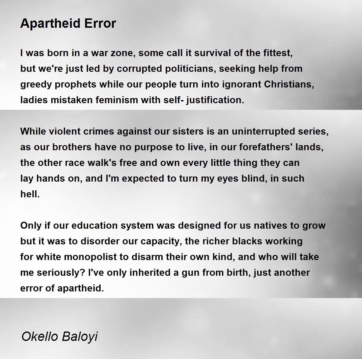 Only if our education system was designed for us natives to grow but it was to disorder our capacity, the richer blacks working for white monopolist to disarm their own kind, and who will take me seriously? I've only inherited a gun from birth, just another error of apartheid.
