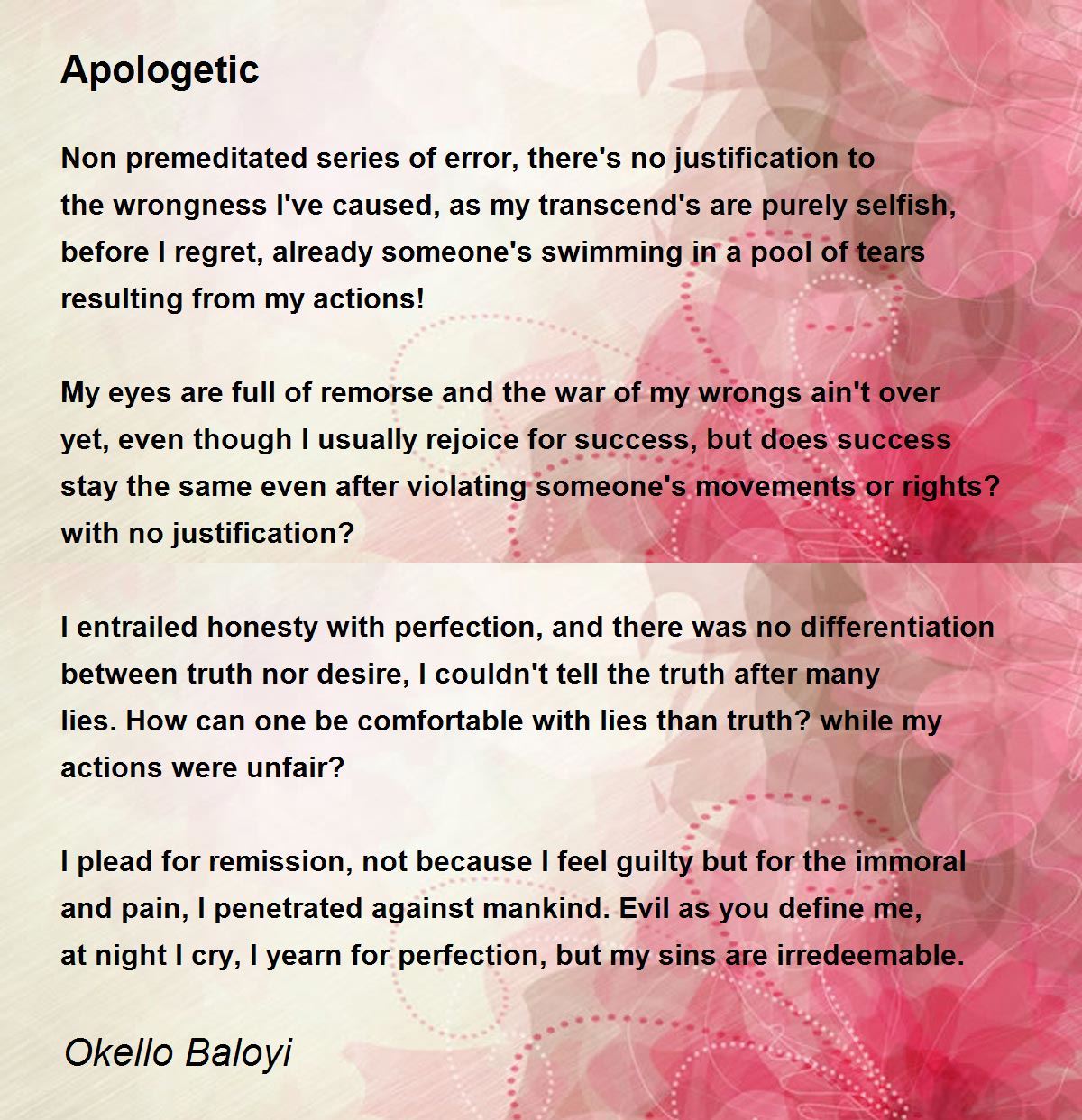 Non premeditated series of error, there's no justification to the wrongness I've caused, as my transcend's are purely selfish, before I regret, already someone's swimming in a pool of tears resulting from my actions!