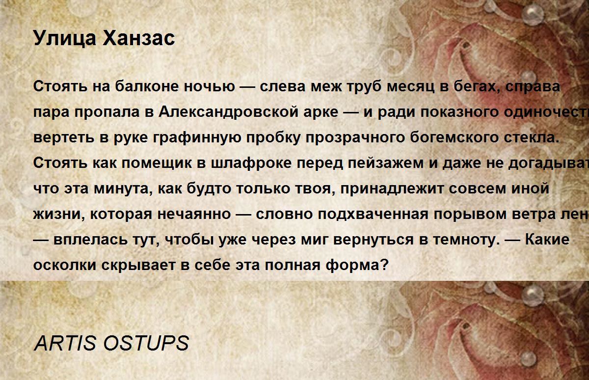 Стоять на балконе ночью — слева меж труб месяц в бегах, справа пара пропала в Александровской арке — и ради показного одиночества вертеть в руке графинную пробку прозрачного богемского стекла. Стоять как помещик в шлафроке перед пейзажем и даже не догадываться, что эта минута, как будто только твоя, принадлежит совсем иной жизни, которая нечаянно — словно подхваченная порывом ветра лента — вплелась тут, чтобы уже через миг вернуться в темноту. — Какие осколки скрывает в себе эта полная форма?