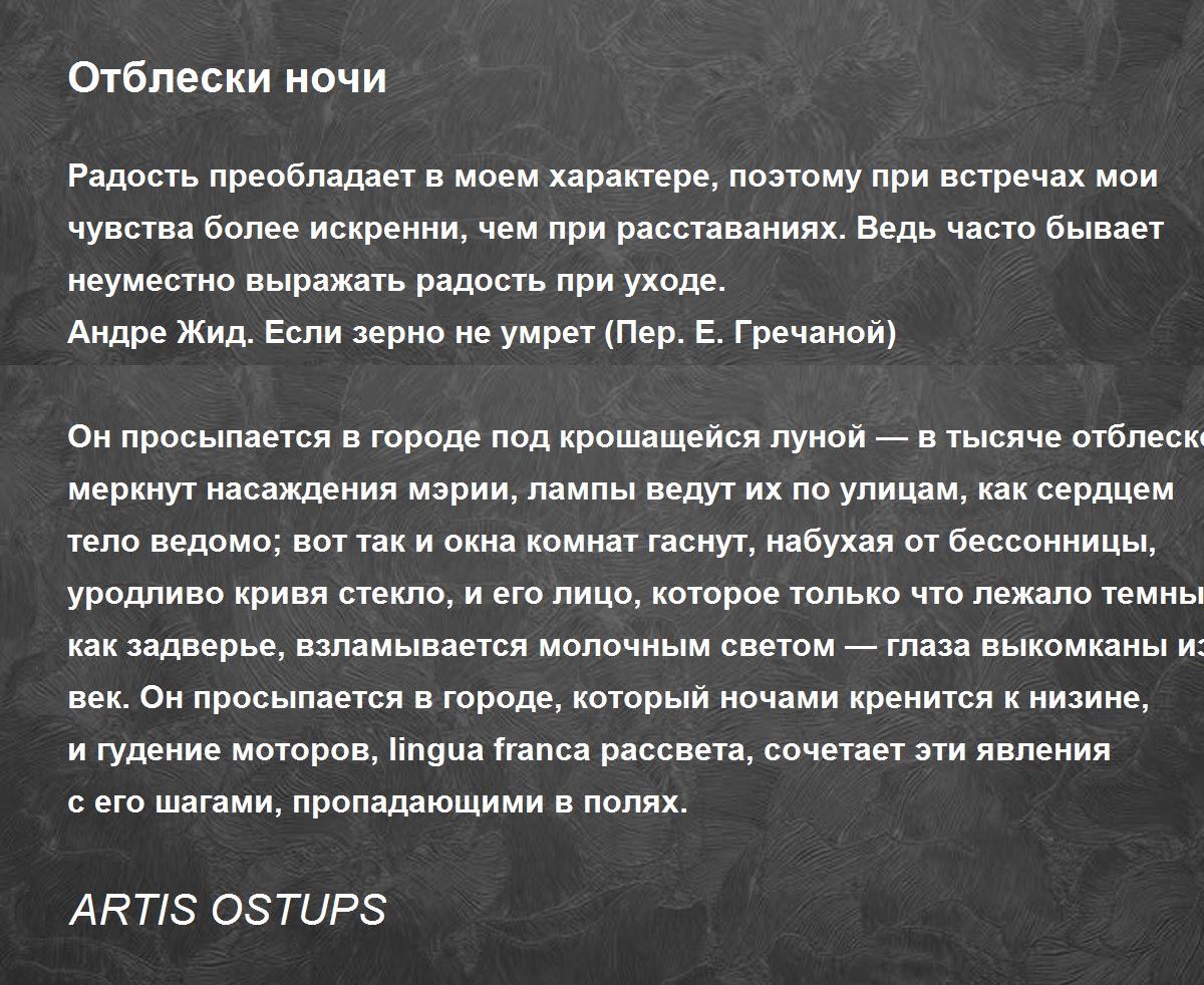 Он просыпается в городе под крошащейся луной — в тысяче отблесков меркнут насаждения мэрии, лампы ведут их по улицам, как сердцем тело ведомо; вот так и окна комнат гаснут, набухая от бессонницы, уродливо кривя стекло, и его лицо, которое только что лежало темным, как задверье, взламывается молочным светом — глаза выкомканы из-под век. Он просыпается в городе, который ночами кренится к низине, и гудение моторов, lingua franca рассвета, сочетает эти явления с его шагами, пропадающими в полях.