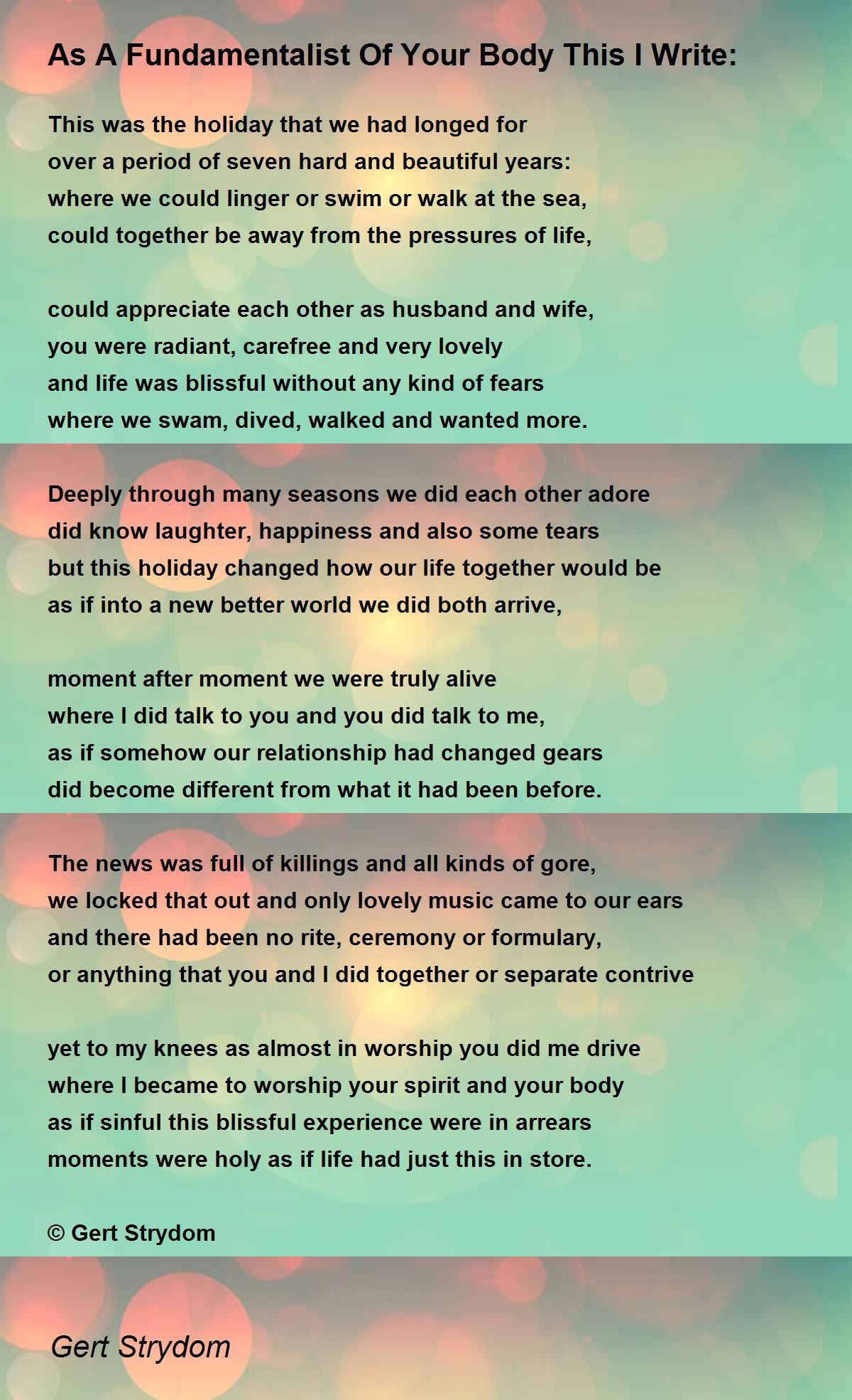 As A Fundamentalist Of Your Body This I Write: Poem by Gert Strydom