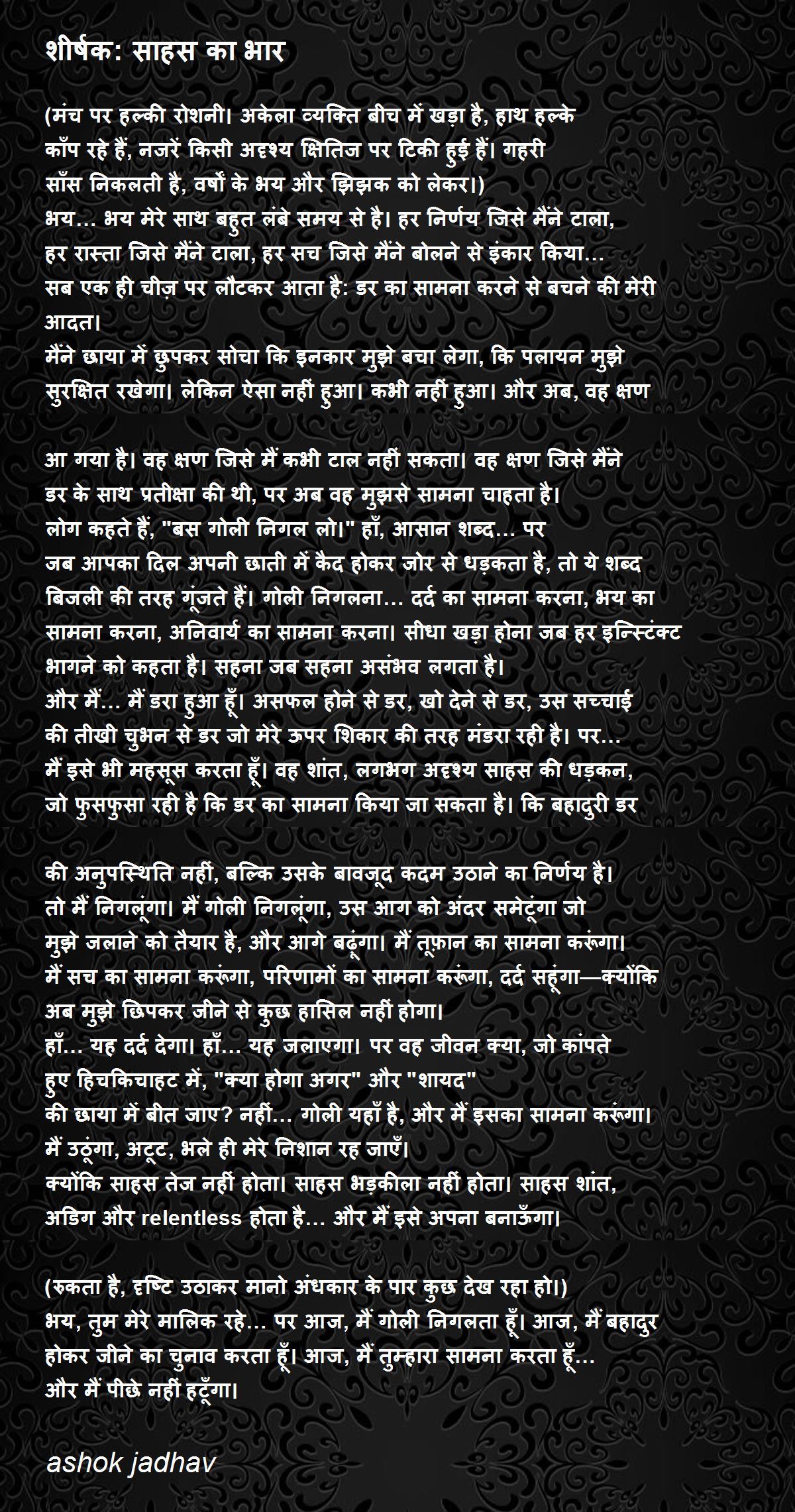 और मैं… मैं डरा हुआ हूँ। असफल होने से डर, खो देने से डर, उस सच्चाई की तीखी चुभन से डर जो मेरे ऊपर शिकार की तरह मंडरा रही है। पर… मैं इसे भी महसूस करता हूँ। वह शांत, लगभग अदृश्य साहस की धड़कन, जो फुसफुसा रही है कि डर का सामना किया जा सकता है। कि बहादुरी डर की अनुपस्थिति नहीं, बल्कि उसके बावजूद कदम उठाने का निर्णय है।