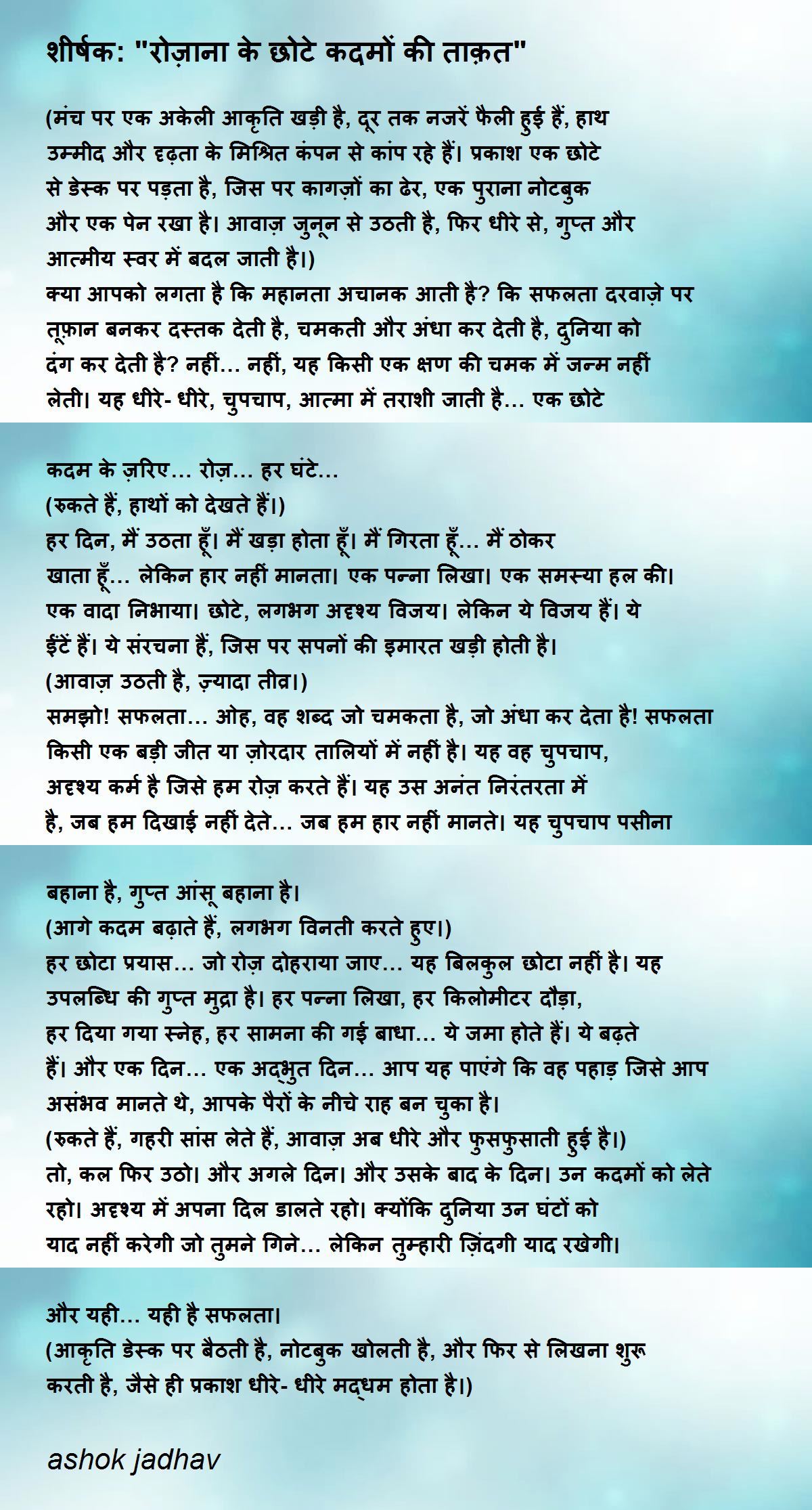 (मंच पर एक अकेली आकृति खड़ी है, दूर तक नजरें फैली हुई हैं, हाथ उम्मीद और दृढ़ता के मिश्रित कंपन से कांप रहे हैं। प्रकाश एक छोटे से डेस्क पर पड़ता है, जिस पर कागज़ों का ढेर, एक पुराना नोटबुक और एक पेन रखा है। आवाज़ जुनून से उठती है, फिर धीरे से, गुप्त और आत्मीय स्वर में बदल जाती है।)