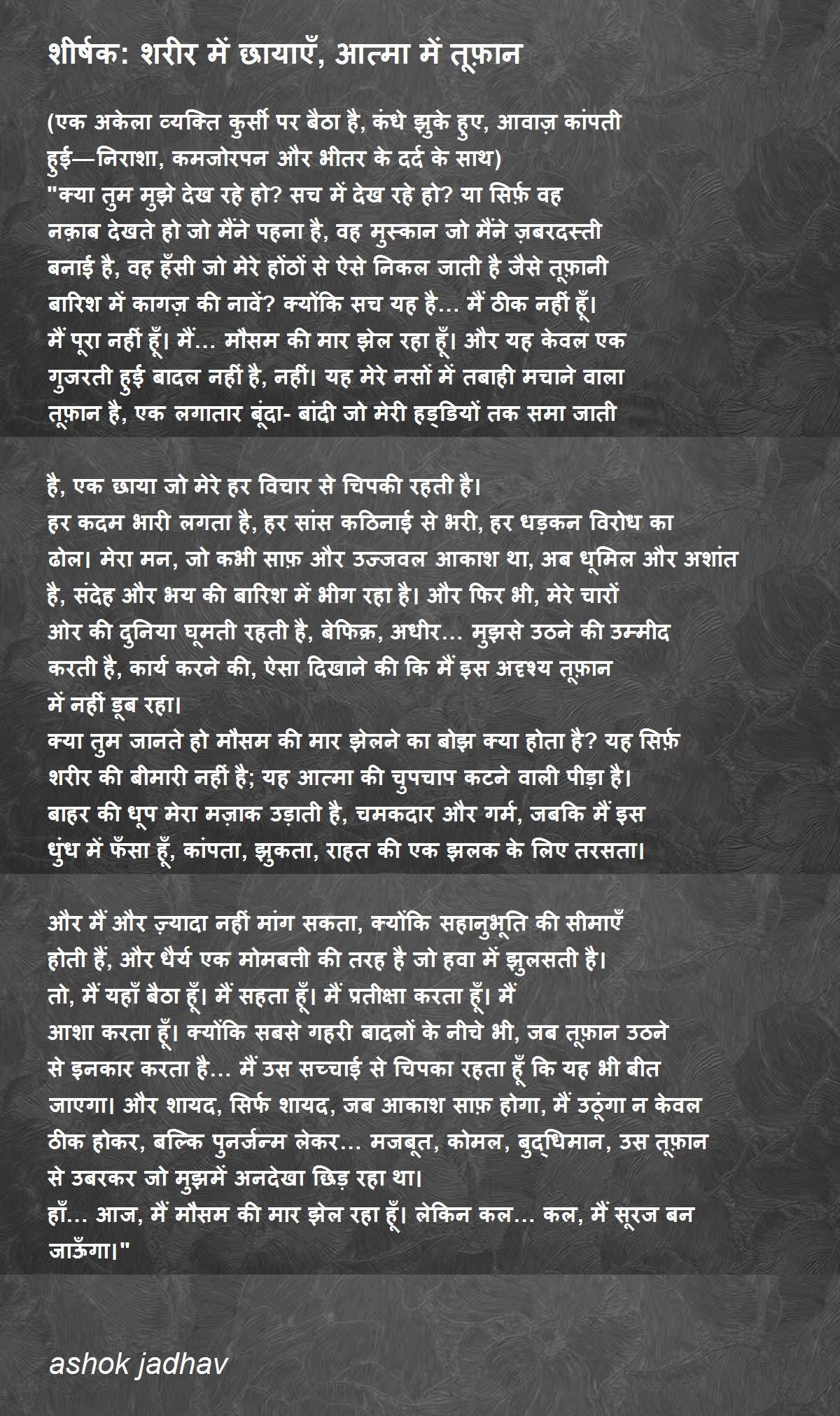 "क्या तुम मुझे देख रहे हो? सच में देख रहे हो? या सिर्फ़ वह नक़ाब देखते हो जो मैंने पहना है, वह मुस्कान जो मैंने ज़बरदस्ती बनाई है, वह हँसी जो मेरे होंठों से ऐसे निकल जाती है जैसे तूफ़ानी बारिश में कागज़ की नावें? क्योंकि सच यह है… मैं ठीक नहीं हूँ। मैं पूरा नहीं हूँ। मैं… मौसम की मार झेल रहा हूँ। और यह केवल एक गुजरती हुई बादल नहीं है, नहीं। यह मेरे नसों में तबाही मचाने वाला तूफ़ान है, एक लगातार बूंदा-बांदी जो मेरी हड्डियों तक समा जाती है, एक छाया जो मेरे हर विचार से चिपकी रहती है।