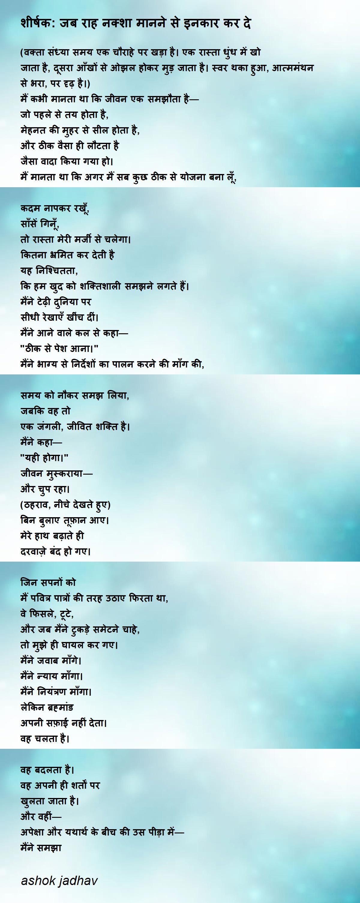 (वक्ता संध्या समय एक चौराहे पर खड़ा है। एक रास्ता धुंध में खो जाता है, दूसरा आँखों से ओझल होकर मुड़ जाता है। स्वर थका हुआ, आत्ममंथन से भरा, पर दृढ़ है।)