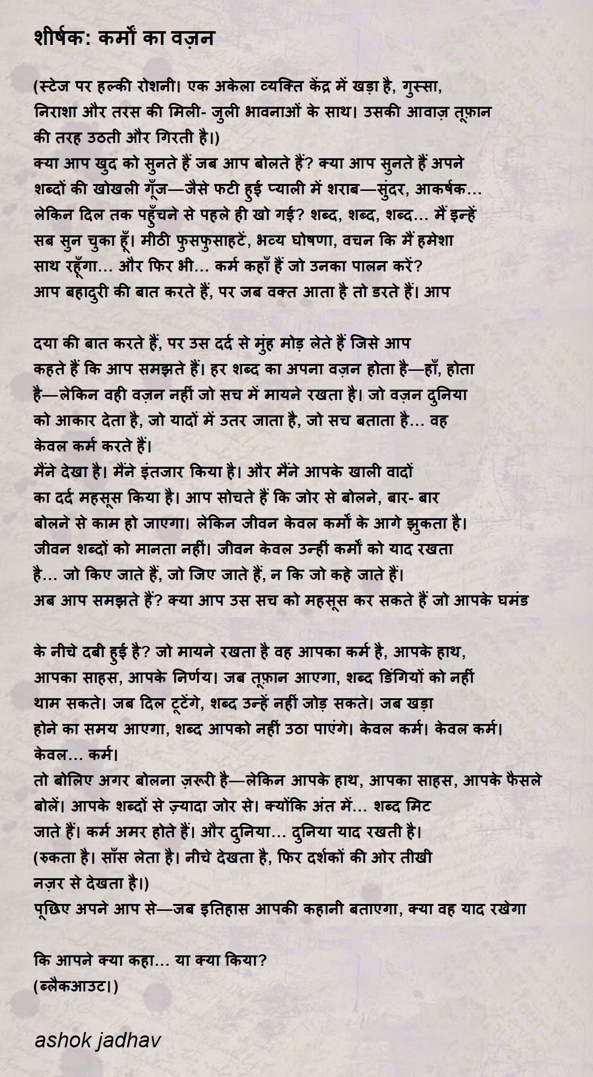मैंने देखा है। मैंने इंतजार किया है। और मैंने आपके खाली वादों का दर्द महसूस किया है। आप सोचते हैं कि जोर से बोलने, बार-बार बोलने से काम हो जाएगा। लेकिन जीवन केवल कर्मों के आगे झुकता है। जीवन शब्दों को मानता नहीं। जीवन केवल उन्हीं कर्मों को याद रखता है… जो किए जाते हैं, जो जिए जाते हैं, न कि जो कहे जाते हैं।