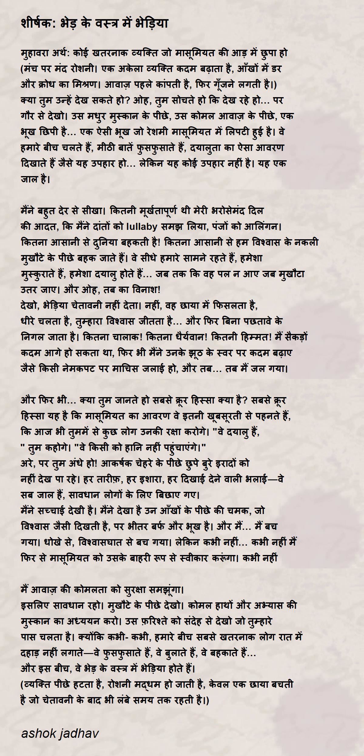 देखो, भेड़िया चेतावनी नहीं देता। नहीं, वह छाया में फिसलता है, धीरे चलता है, तुम्हारा विश्वास जीतता है… और फिर बिना पछतावे के निगल जाता है। कितना चालाक! कितना धैर्यवान! कितनी हिम्मत! मैं सैकड़ों कदम आगे हो सकता था, फिर भी मैंने उनके झूठ के स्वर पर कदम बढ़ाए जैसे किसी नेमकपट पर माचिस जलाई हो, और तब… तब मैं जल गया।