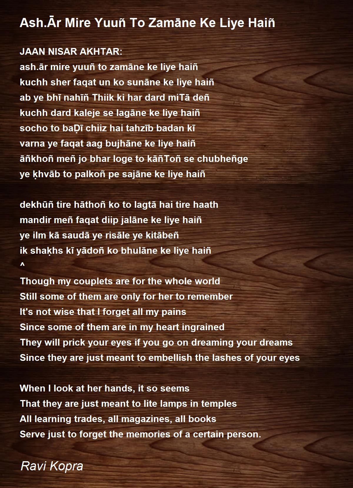 ash.ār mire yuuñ to zamāne ke liye haiñ