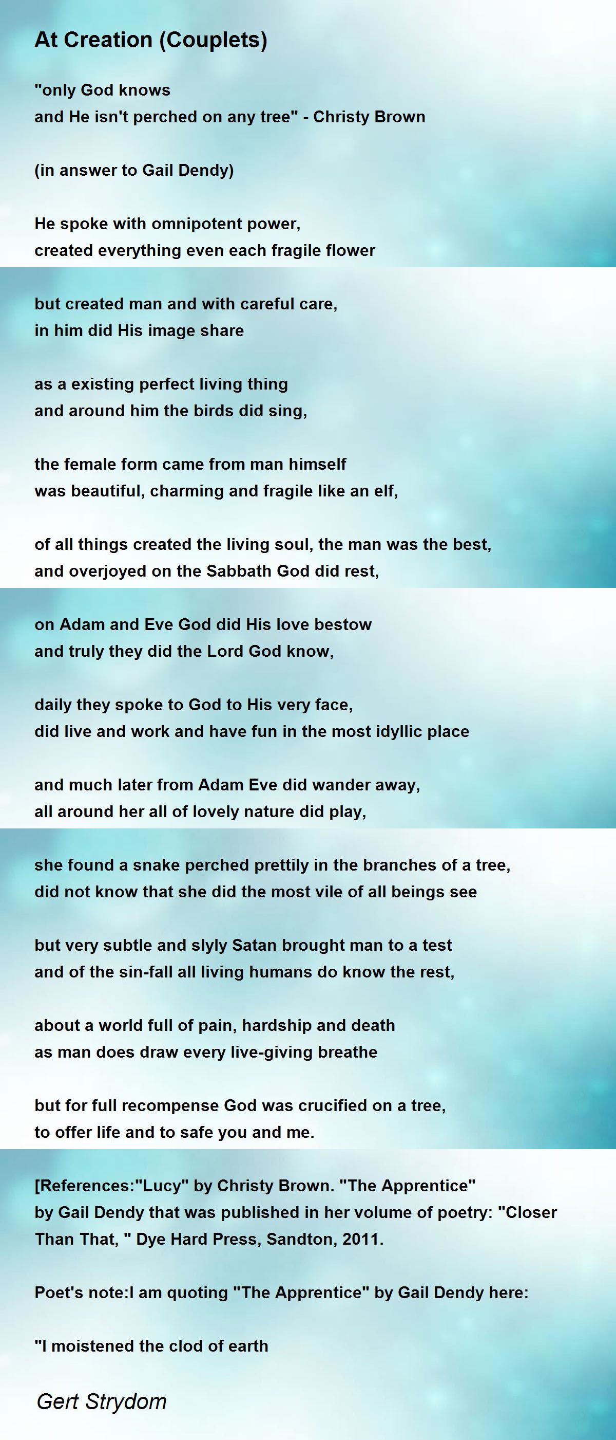 [References:"Lucy" by Christy Brown."The Apprentice" by Gail Dendy that was published in her volume of poetry: "Closer Than That, " Dye Hard Press, Sandton,2011.