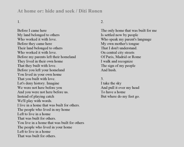 Poetry is indeed a great medium for reflection of thoughts and you have aptly described what's the feeling of being left alone. stigmatized by isolation and estrangement. Bigotry is not our problem but problem of all mankind. As two distinct nations, Jews and Muslims clashed have widened the breach of mistrust between the two. I really feel it in your lines. But don't give your heart away to hatred. It consumes even the innocent. Shalom. I love your poem :) ...........10