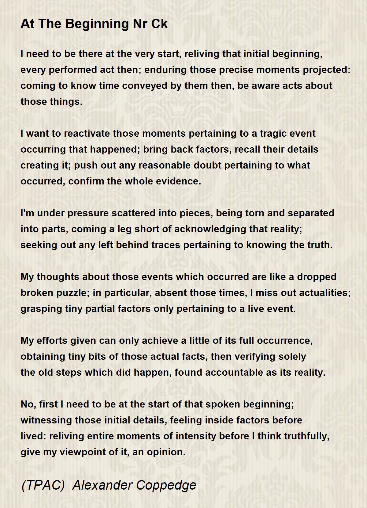 No, first I need to be at the start of that spoken beginning; witnessing those initial details, feeling inside factors before lived: reliving entire moments of intensity before I think truthfully, give my viewpoint of it, an opinion.