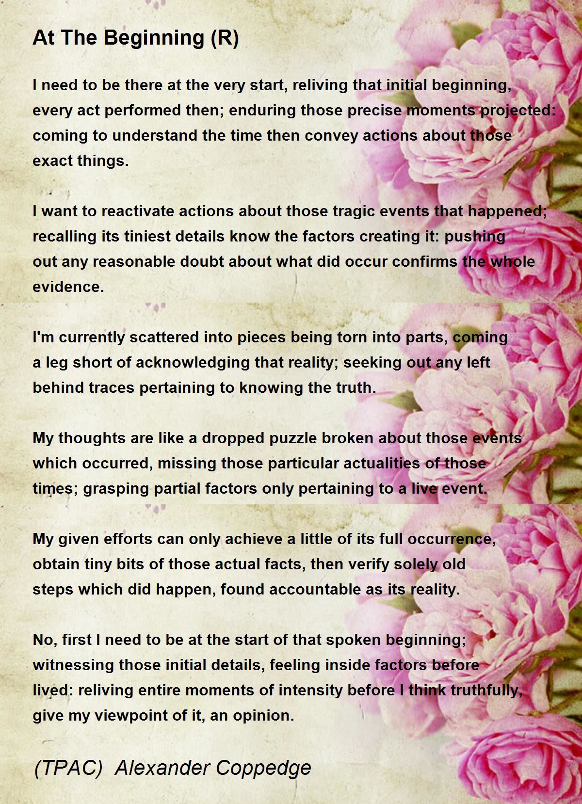 I need to be there at the very start, reliving that initial beginning, every act performed then; enduring those precise moments projected: coming to understand the time then convey actions about those exact things.
