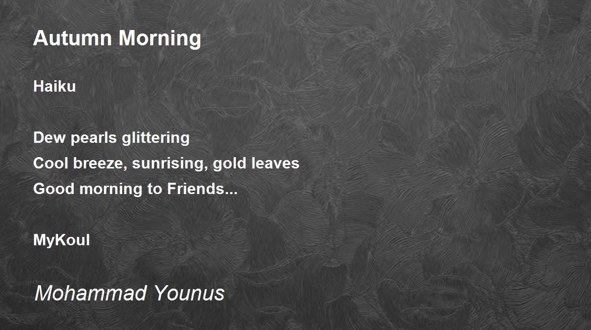 Haiku Dew pearls glittering Cool breeze, sunrising, gold leaves Good morning to Friends... MyKoul