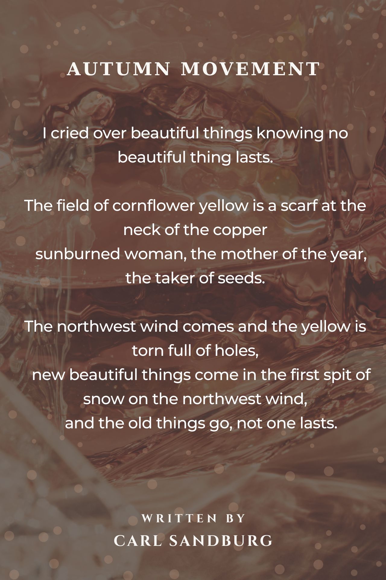 Everything passes- a sad truth beautifully said in this poem. Yet Sandburg holds out the promise that more beautiful things will come and be enjoyed before they too pass away. I did not like his poetry when I was younger- now that I am wiser, I see the power in his unique vision.