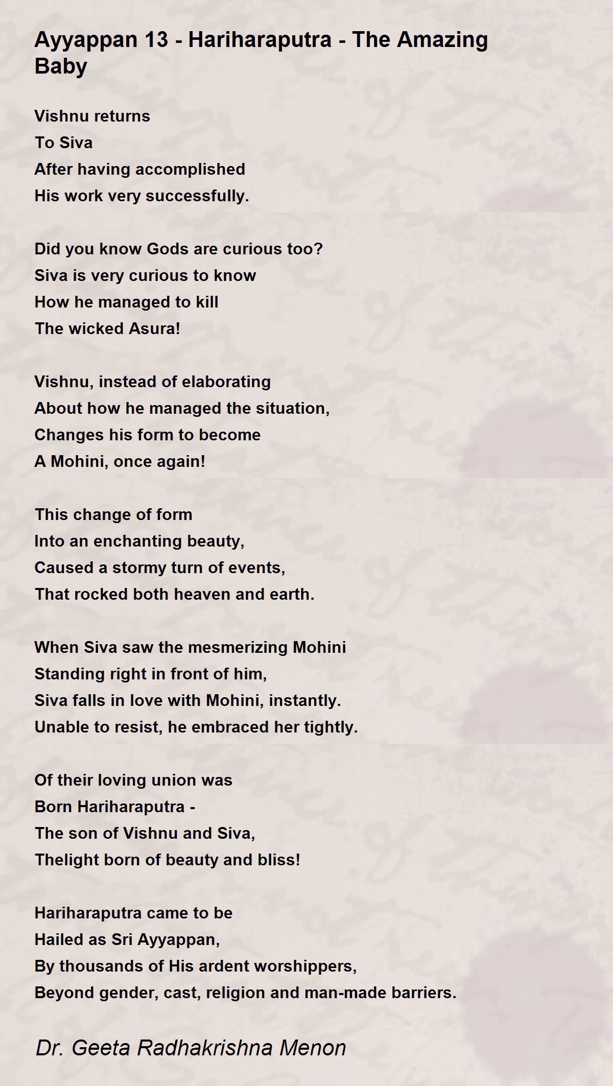 (2) He- Harihara Putra Lord Ayyappan- symbolises the synthesis or the unity of two streams of thought- Vaishnavait and Shaivait. This fine work of literature comes out of your spiritual contemplation, scriptural studies plus your training and research as a Classical Danseuse. Thank you, Geeta ji, for making us familiar with our own diverse culture. Of their loving union was / Born Hariharaputra - The son of Vishnu and Siva / Thelight born of beauty and bliss!