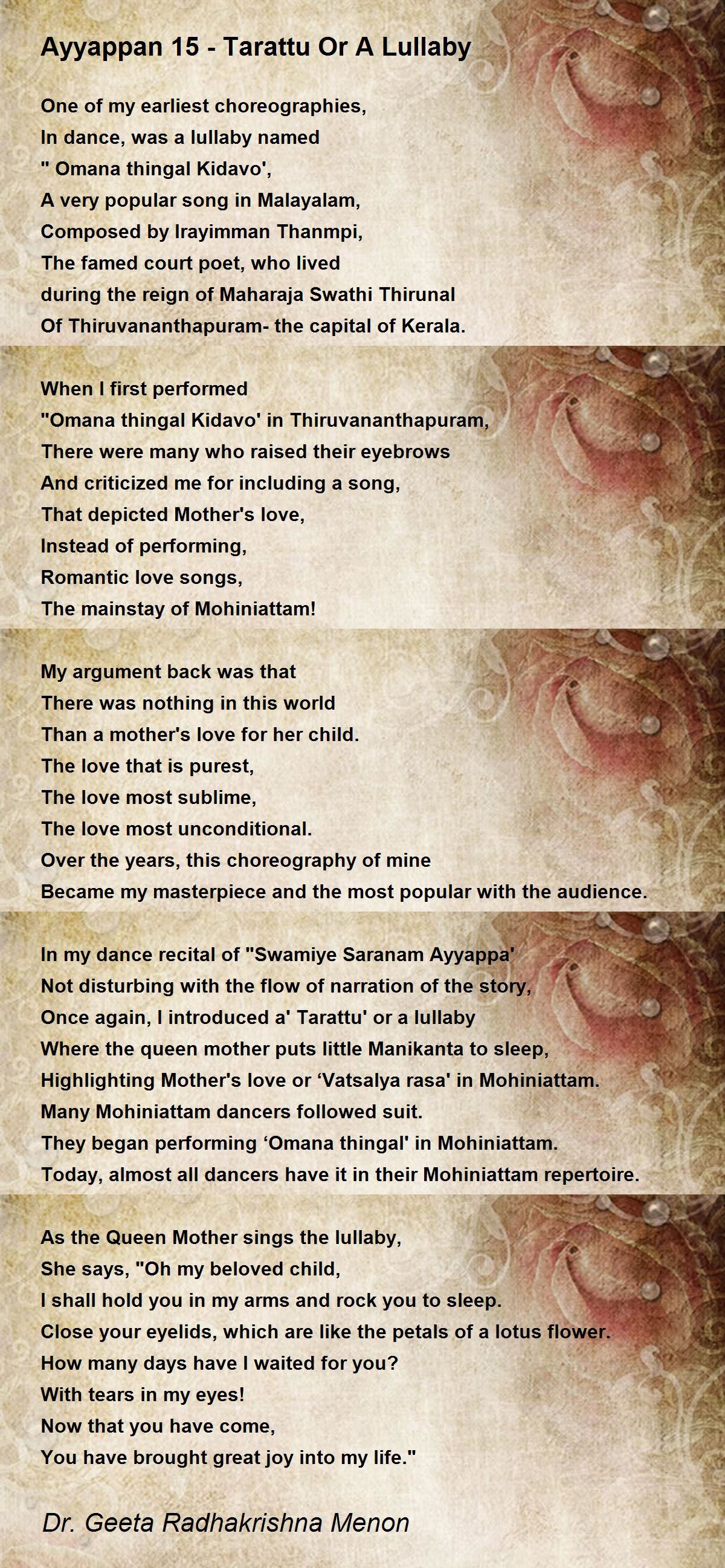 This poem regarding ' Ayyappan' a popular deity of Kerala, worshipped by countless devotees in South India, the son of Hari and Hara and about unconditional love of mother and regarding dance has a vital role in this poem hunter site. Thank you dear madam for sharing this poem having extraction from your book ' Mohiniattam -The Dance of the Enchantress" Part 2.