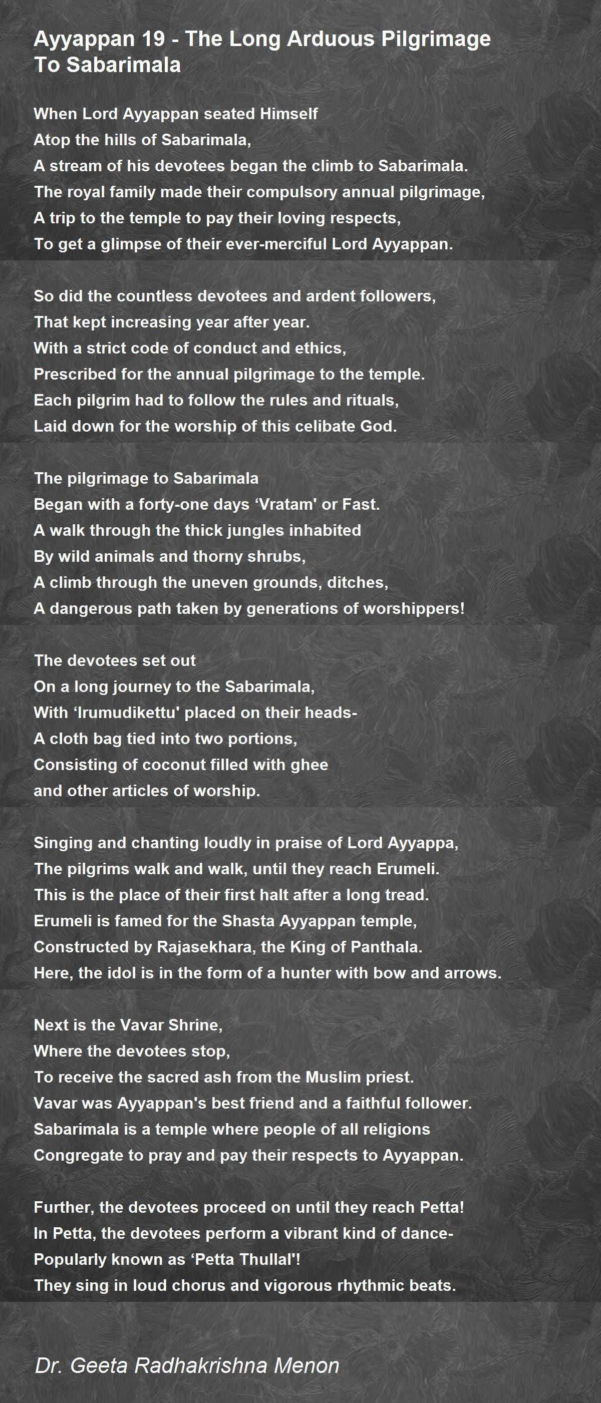 A stream of his devotees began the climb to Sabarimala and royal family declared the visits of pilgrimage. A day's rest and worship at Pamba River motivated many to visit. This is an excellent and informative devotional poem shared here.10
