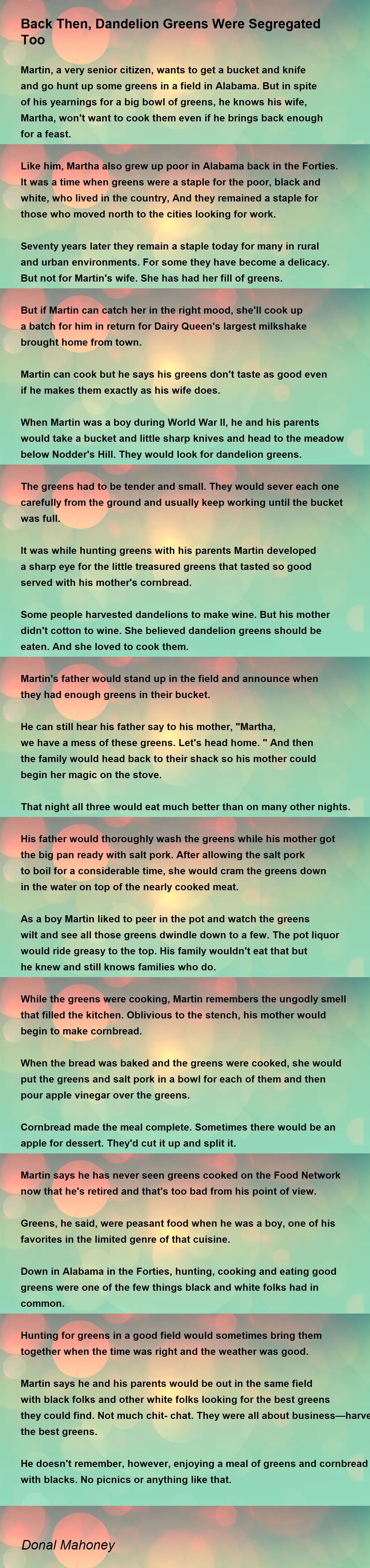 He can still hear his father say to his mother, "Martha, we have a mess of these greens. Let's head home." And then the family would head back to their shack so his mother could begin her magic on the stove.
