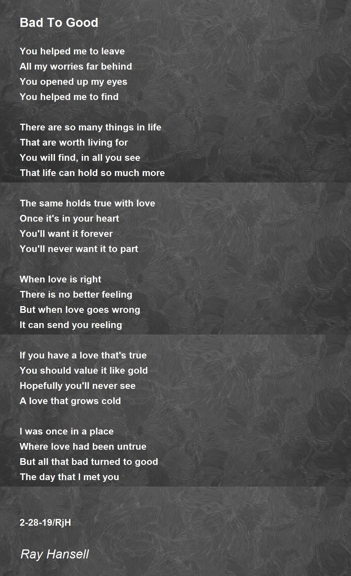 Bad to Good is indeed a very Good poem! Love is worth waiting for, fighting for, and working to preserve and maintain it, once it is experienced.