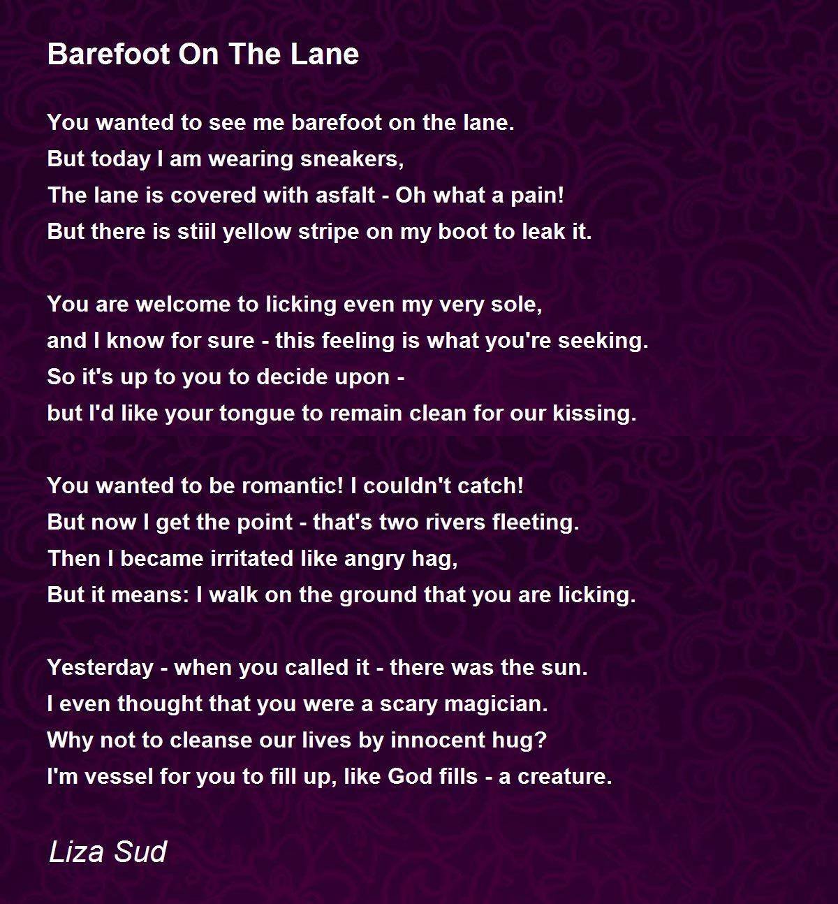 Wow! I don't want to make a statement that seems too exaggerated to be true, so let me just say: THIS IS MY FAVORITE POEM OF SUMMER OF 2016! ! I just love its sincerity, its humor, its wonderful celebration of togetherness. I like INNOCENCE as the topic. And that is echoed in the closing image: WHY NOT CLEANSE OUR LIVES BY AN INNOCENT HUG? Why not! I'm convinced. This is your parallel poem to my O AND E poem. You are barefoot in this poem just as I described Eurydice on the lane. Your poem makes me happy! I won't debate my choice of words. Happy identifies my present mood and it will take something really bad to dispel. I don't see that happening. Liza, you're the sweetness of life.