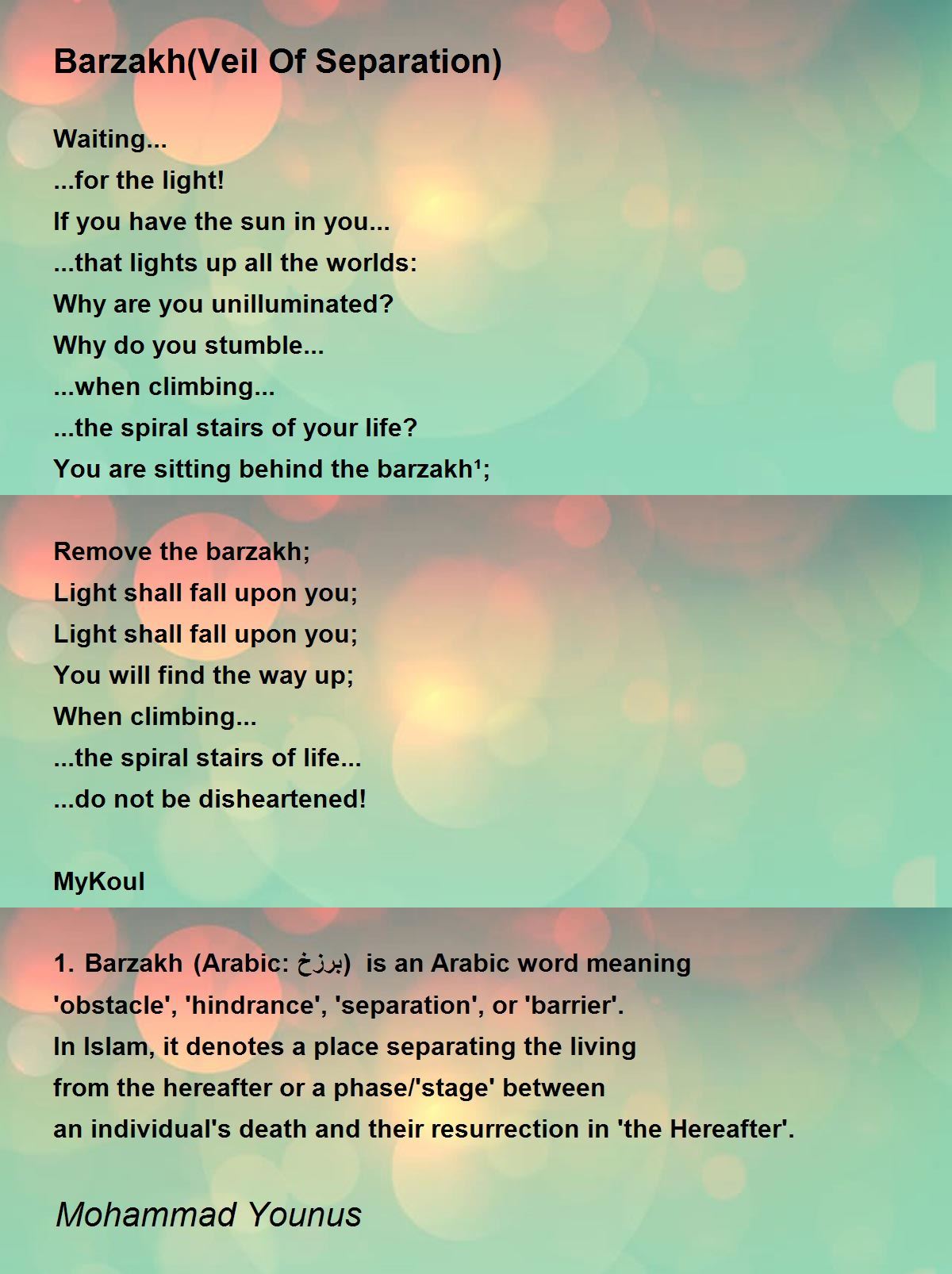 1. Barzakh (Arabic: برزخ) is an Arabic word meaning