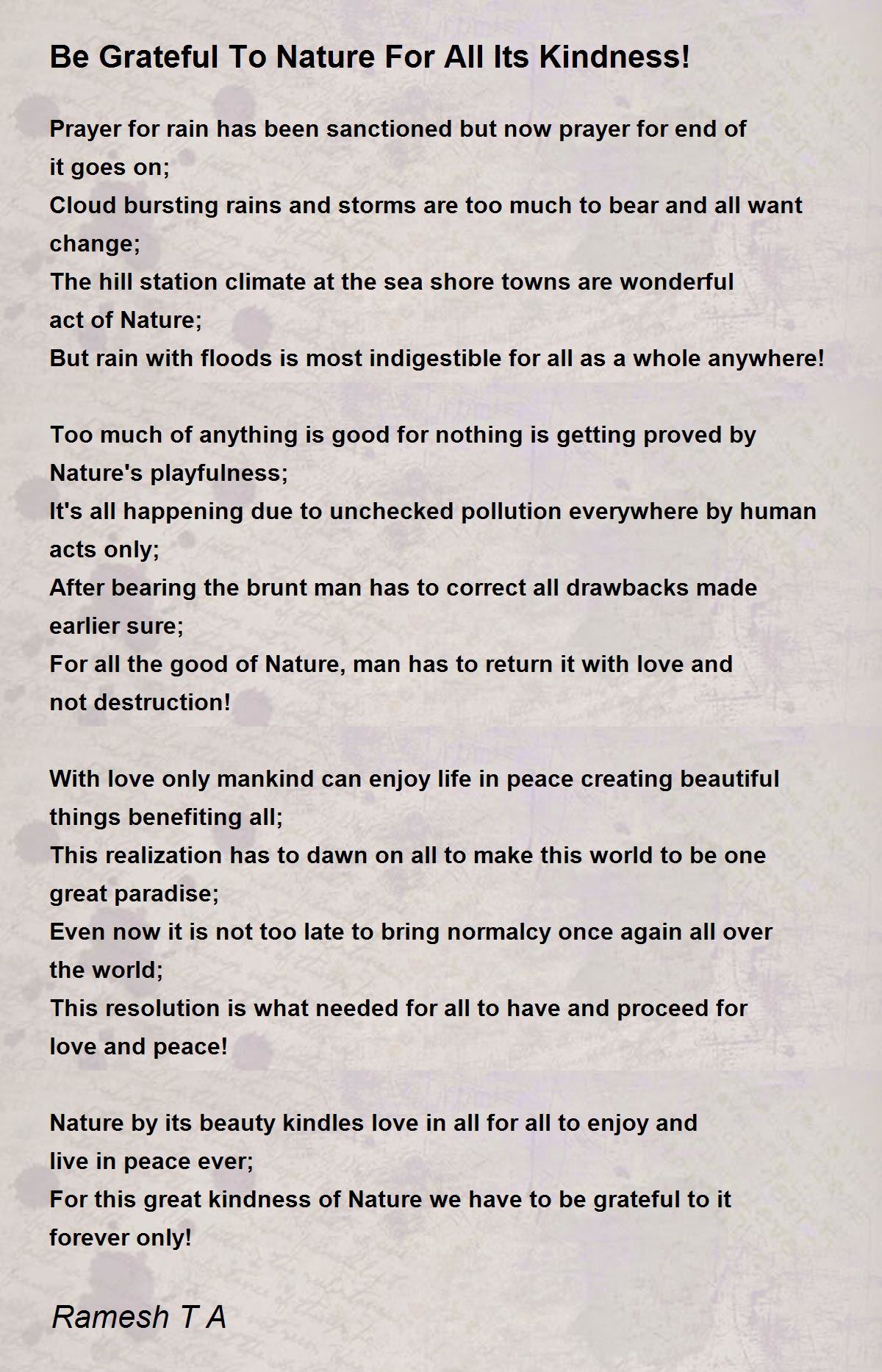 Nature by its beauty kindles love in all for all to enjoy and live in peace ever; For this great kindness of Nature we have to be grateful to it forever only!